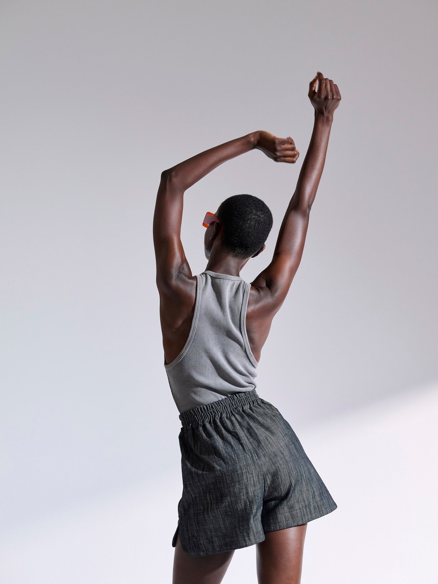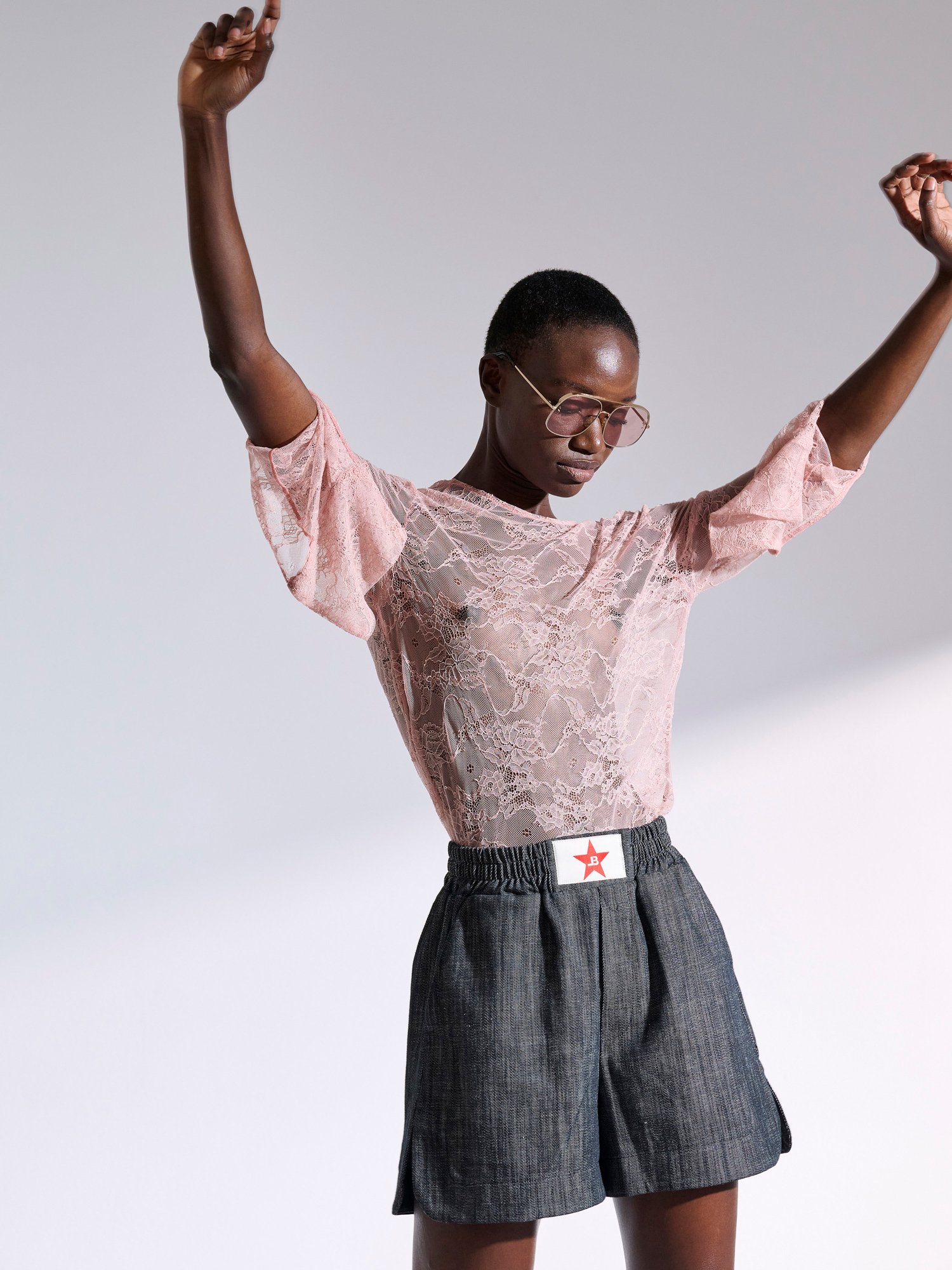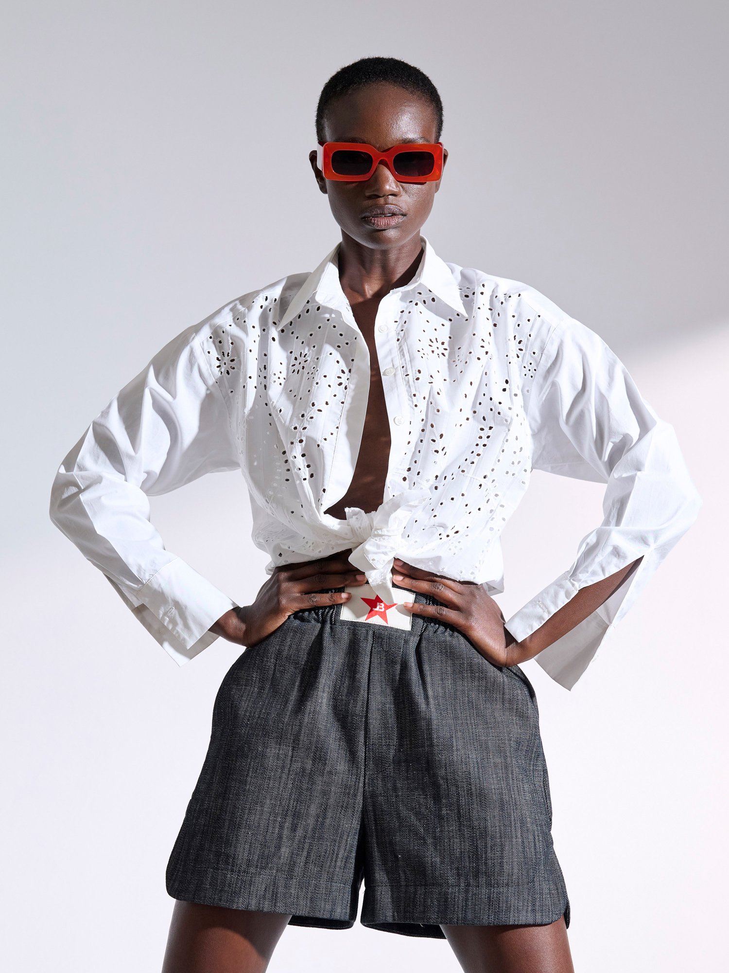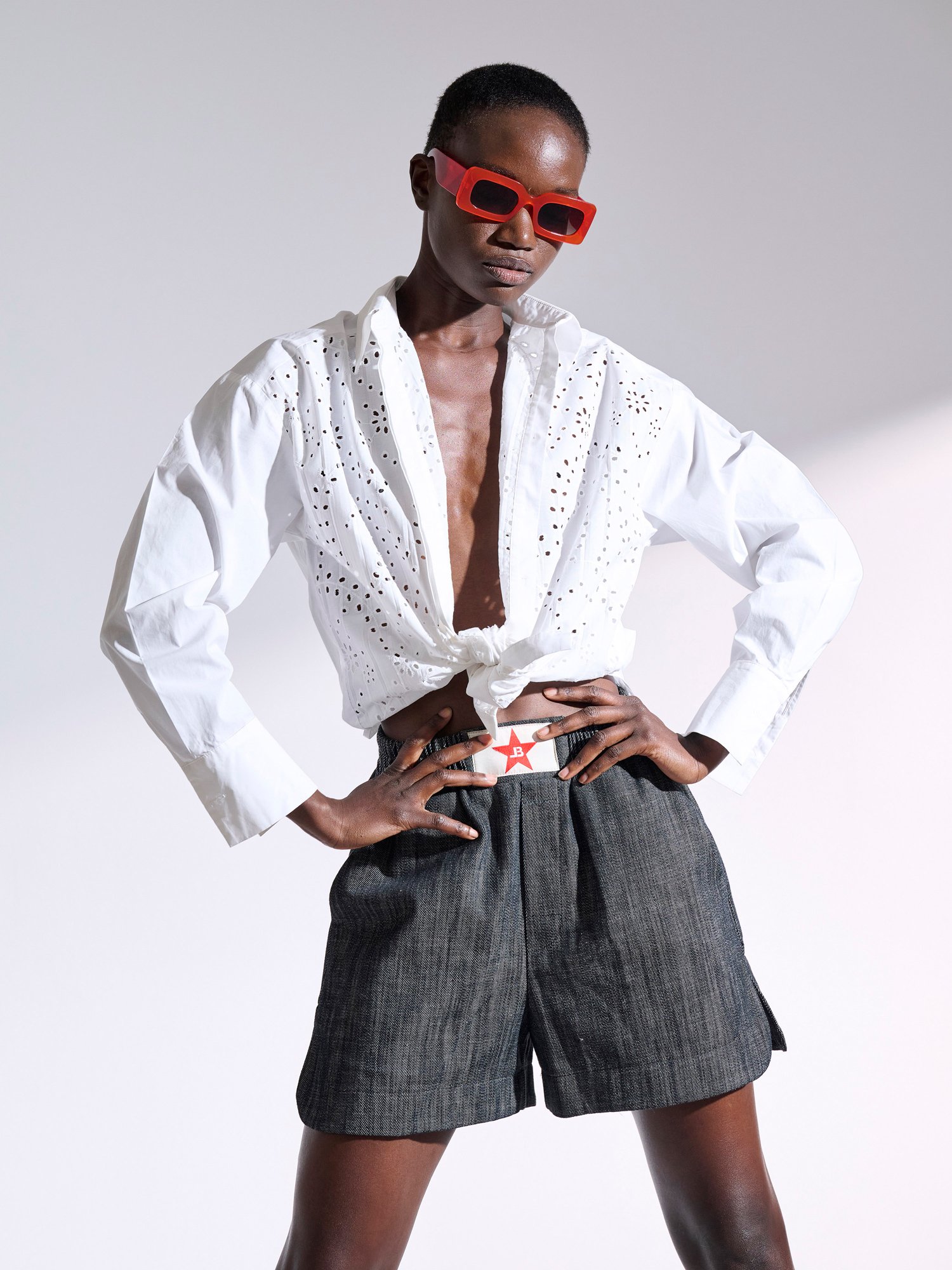 Έχει φαρδύ λάστιχο στη μέση με διακοσμητική υφαντή ετικέτα και τσέπες στο πλάι.