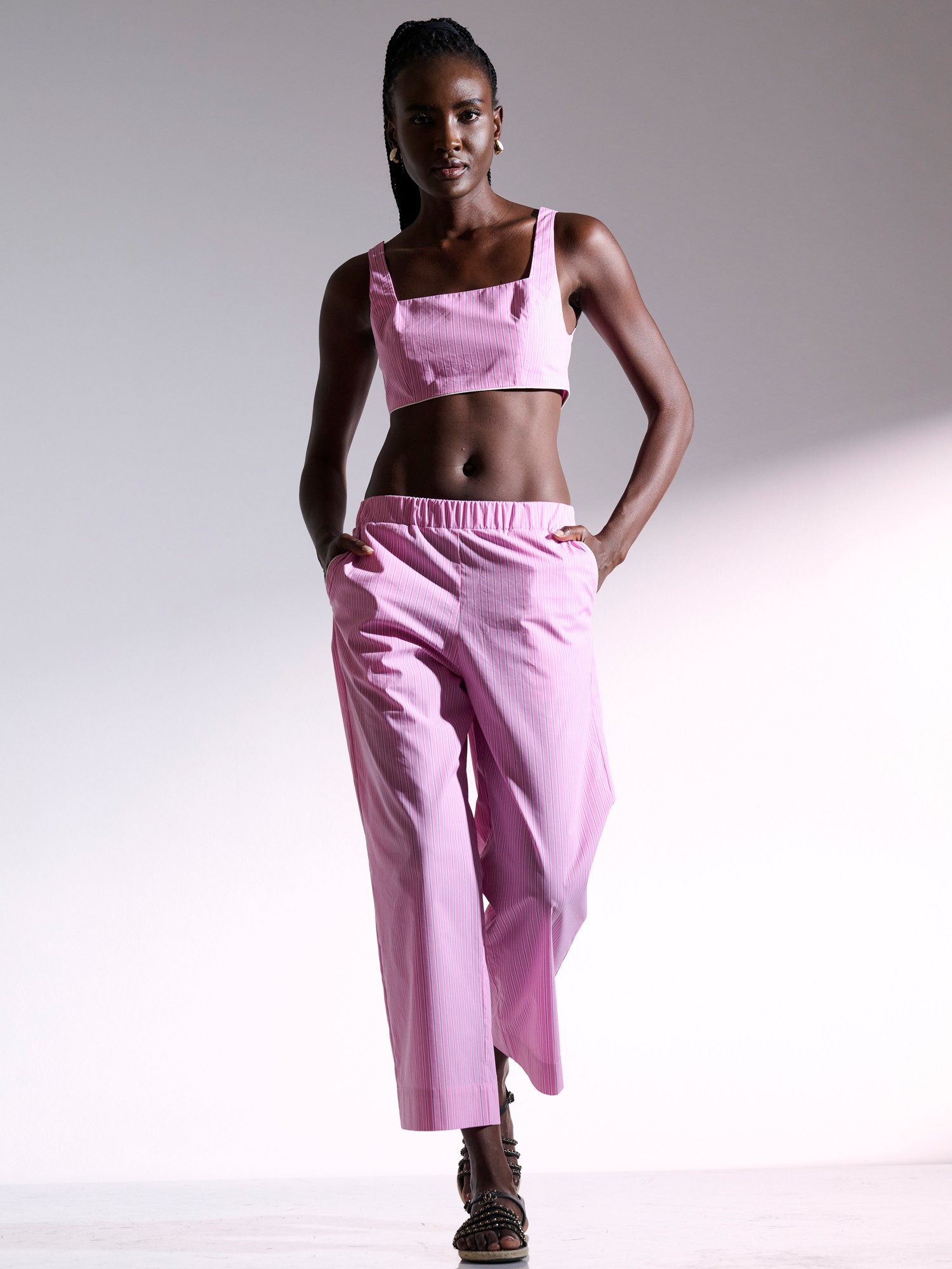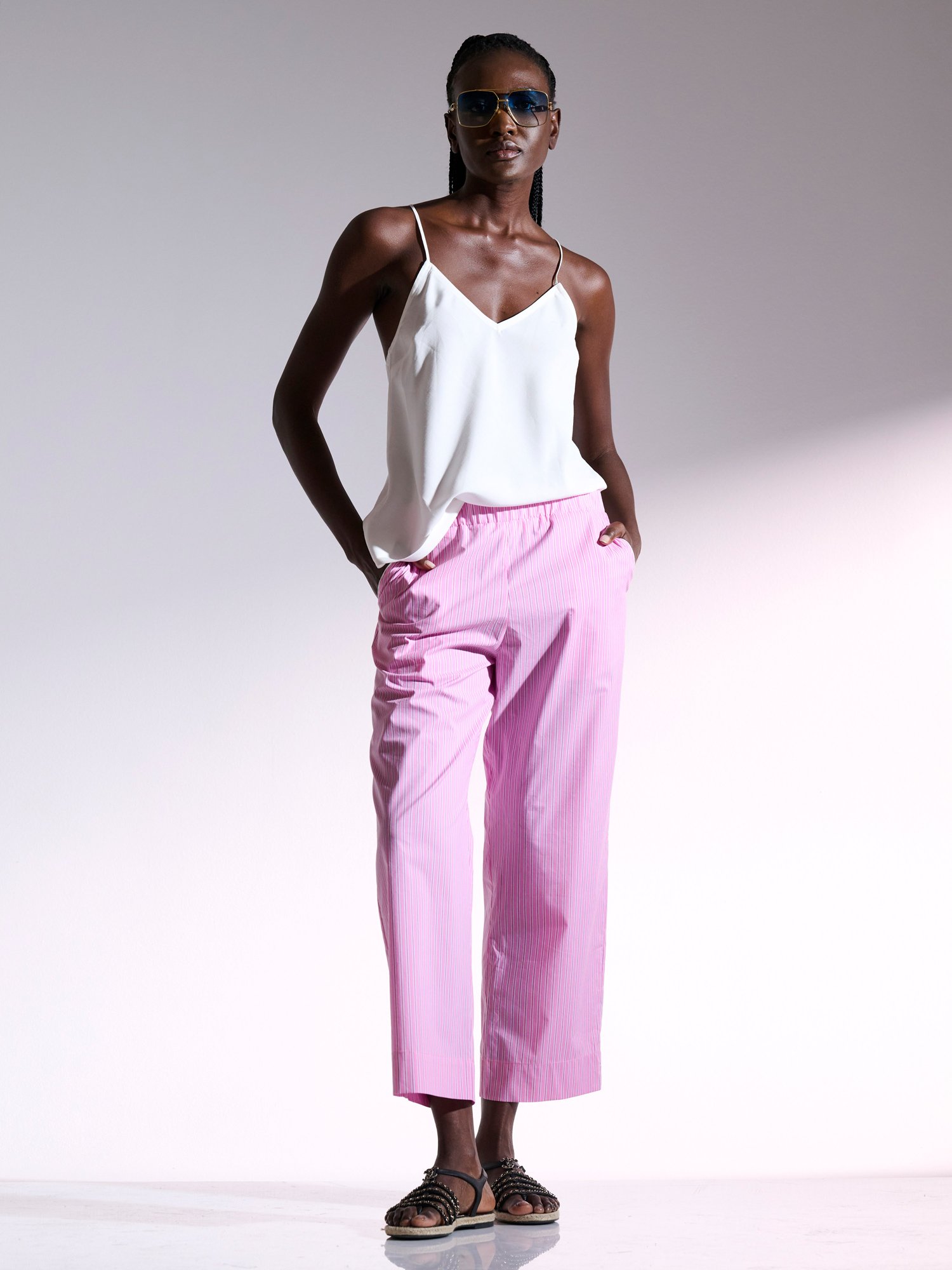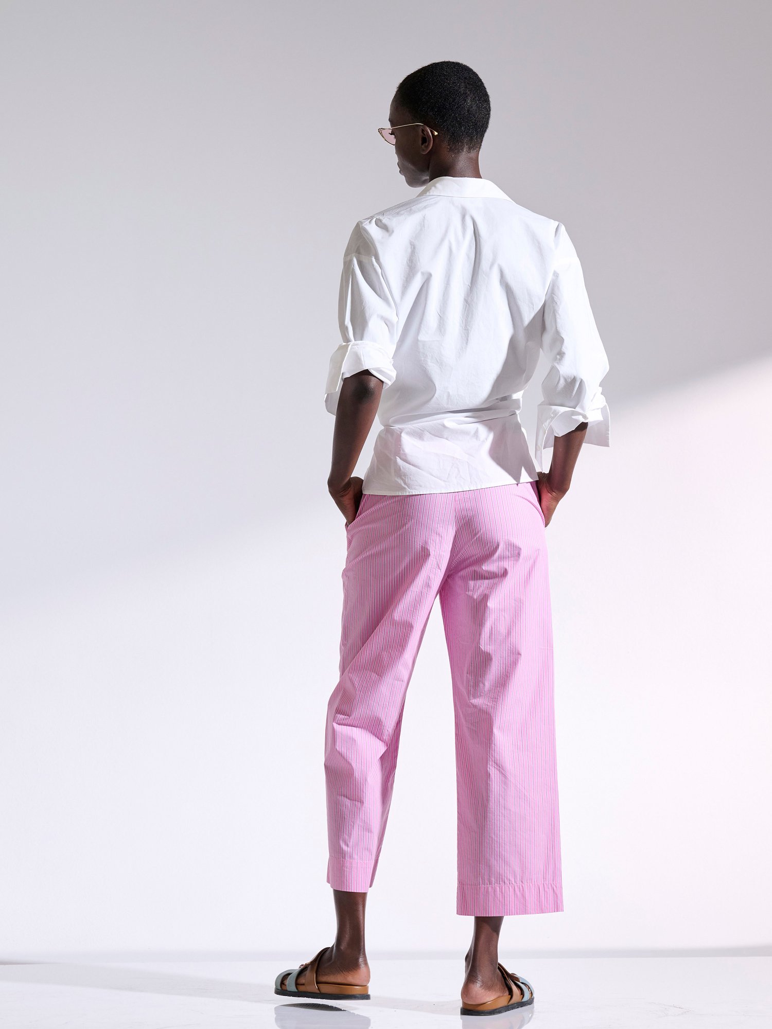 Κροπ παντελόνι ριγέ σε ίσια γραμμή από βαμβακερή ποπλίνα με μικρή ελαστικότητα σε αποχρώσεις ροζ και λευκό.