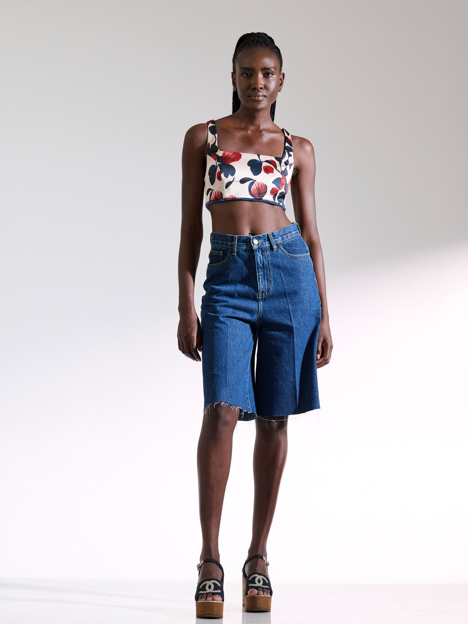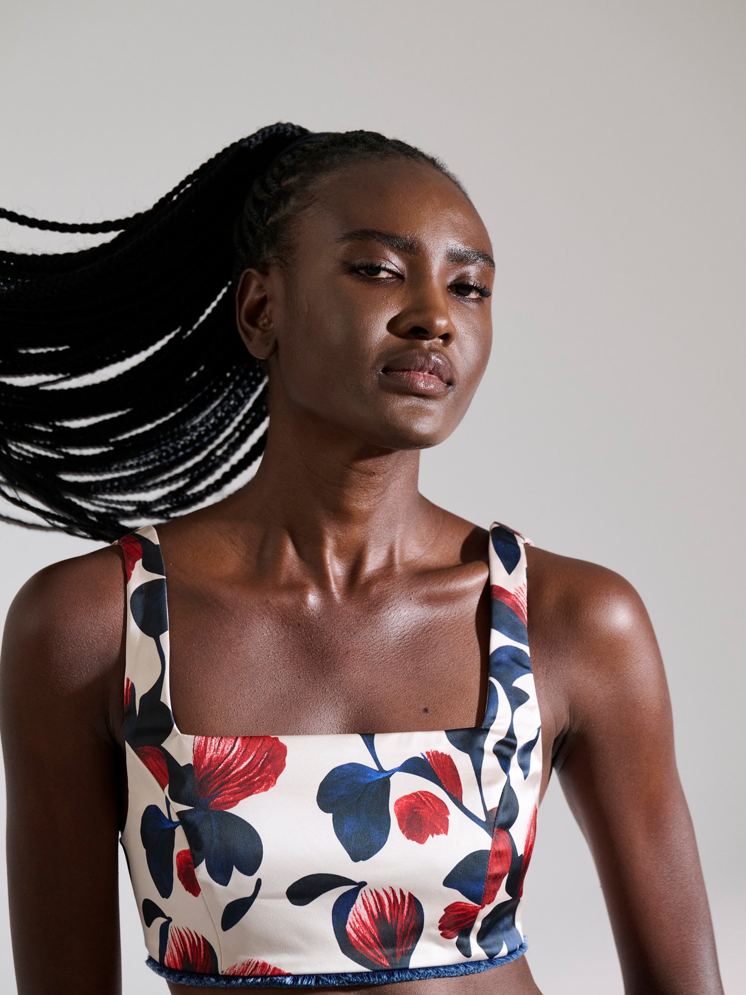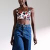 Κροπ τοπ φλοράλ με τιράντες σε στενή γραμμή από ματ σατέν ύφασμα με ελαστικότητα.