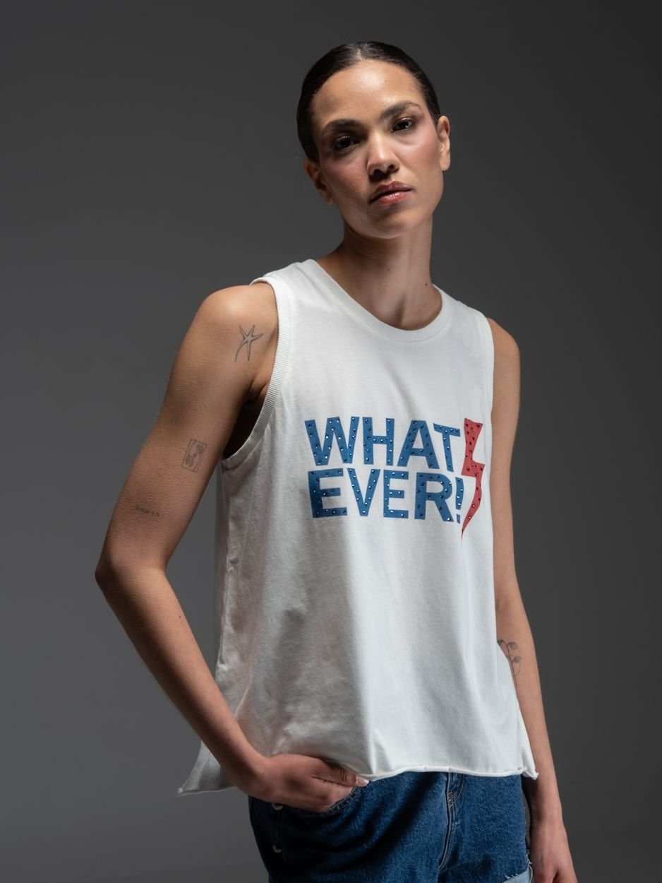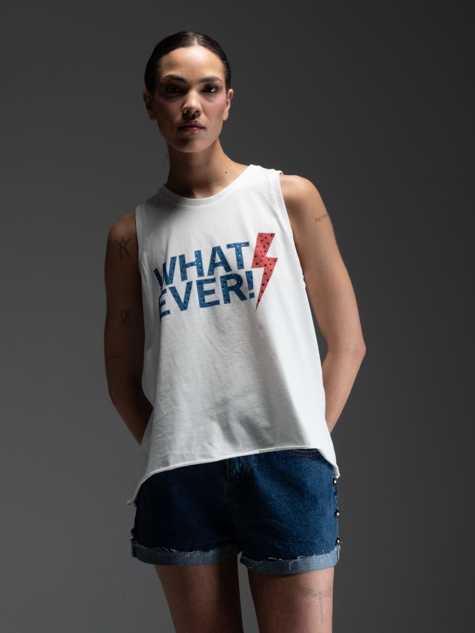 Λευκό αμάνικο t-shirt με τύπωμα "WHATEVER" & κρύσταλλα KODA