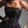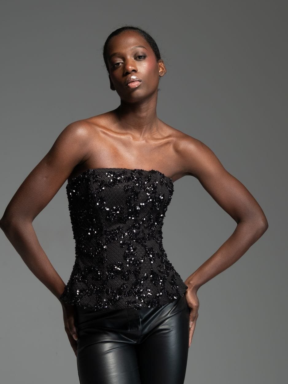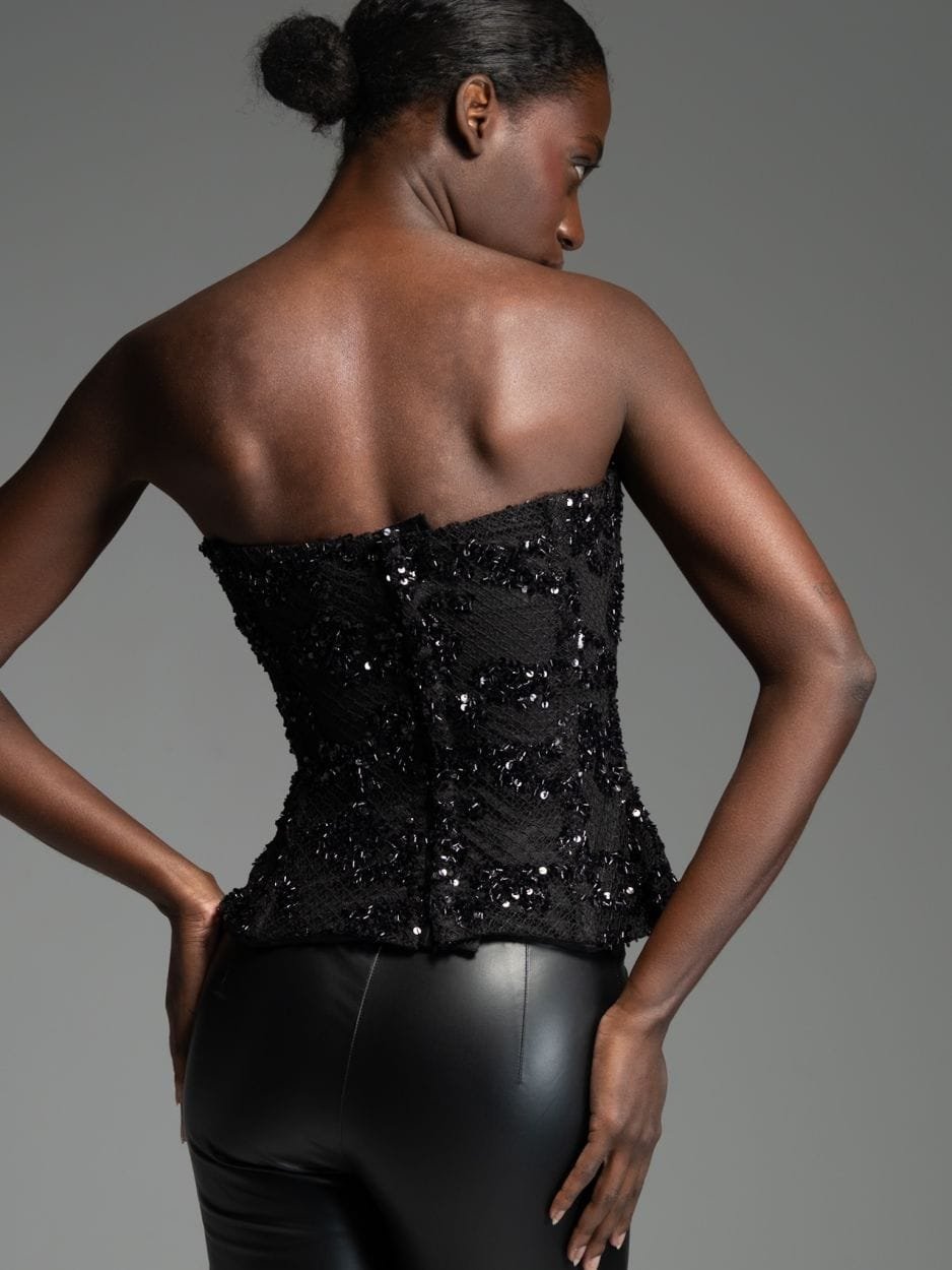 Μαύρο στράπλες κορσέ από μοναδικό ύφασμα με δίχτυ και κεντημένες παγιέτες σε ανάγλυφο σχέδιο. Διαθέτει κάθετες μπανέλες περιμετρικά που διαμορφώνουν και στηρίζουν το σώμα, καθώς και εσωτερική επένδυση από μαύρο κορσέ και foam για άνεση και σταθερή εφαρμογή.