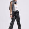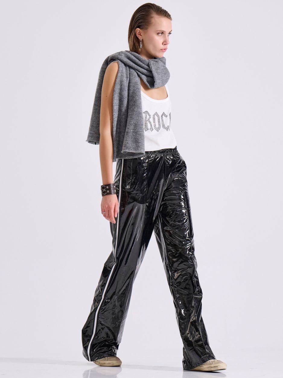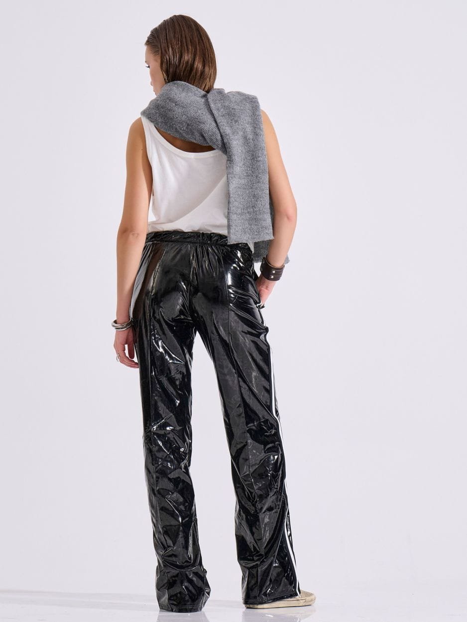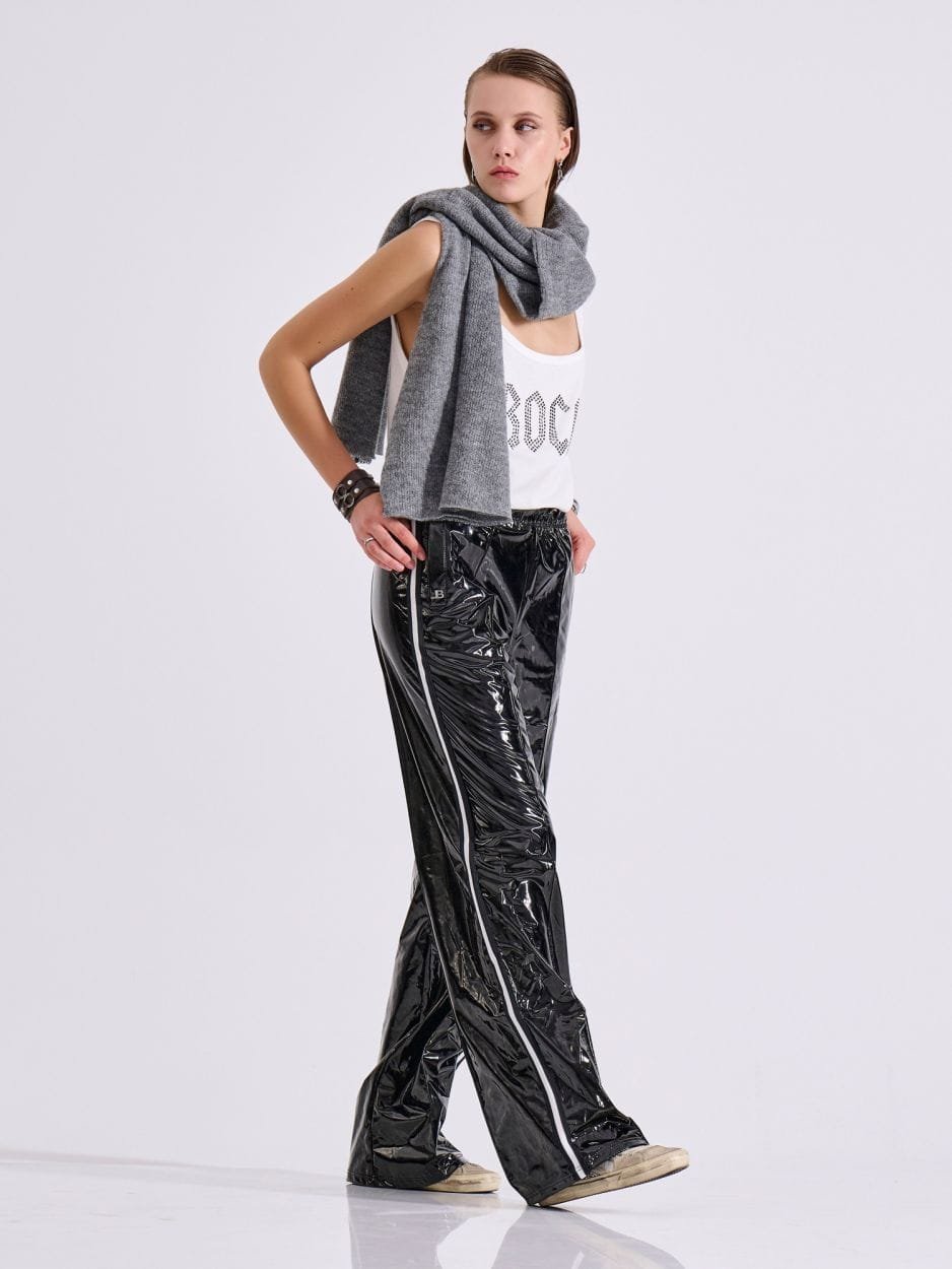 Αθλητικό παντελόνι φόρμας σε μαύρο χρώμα από γυαλιστερό βινύλ ύφασμα με διπλή ελαστικότητα, που χαρίζει άνεση και ξεχωριστό χαρακτήρα.