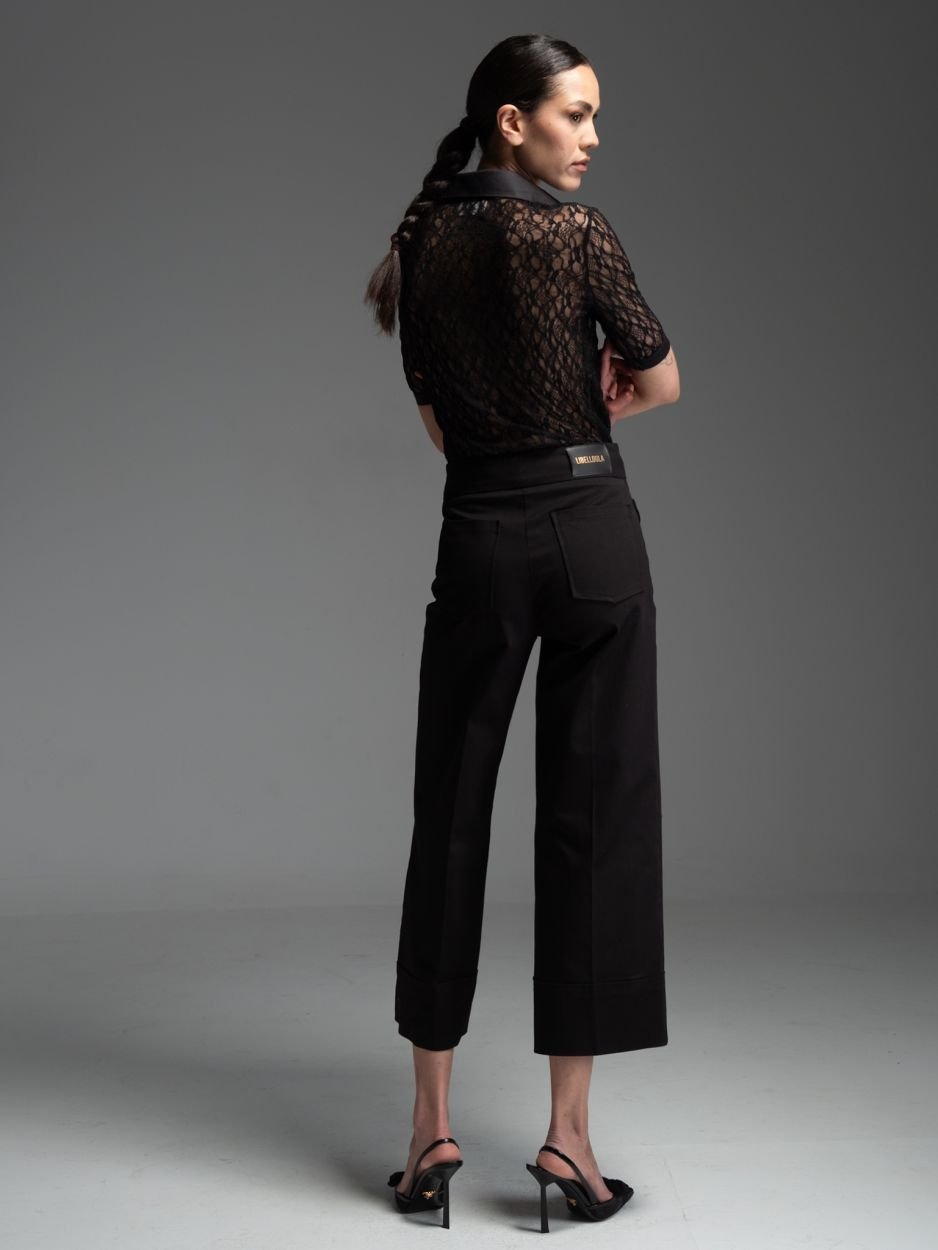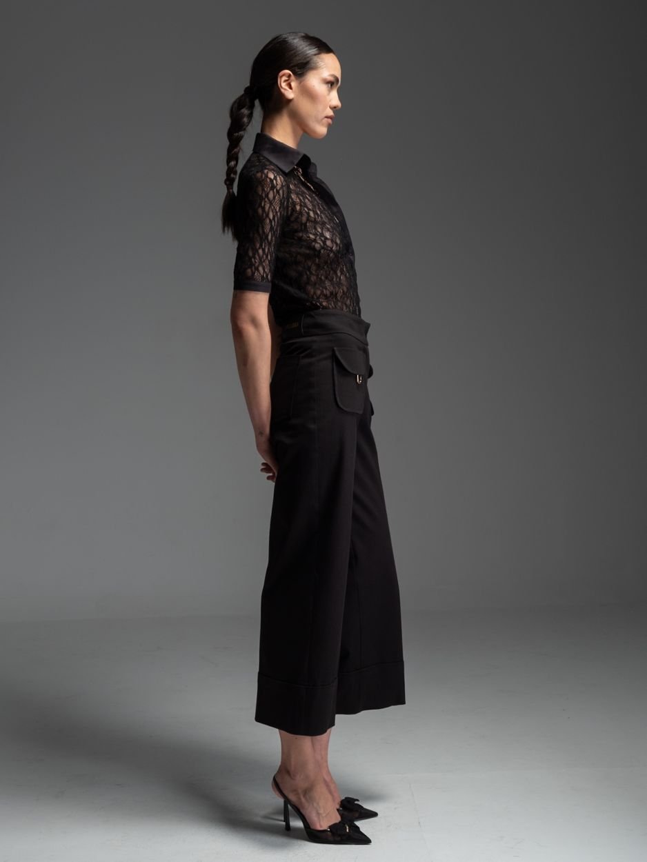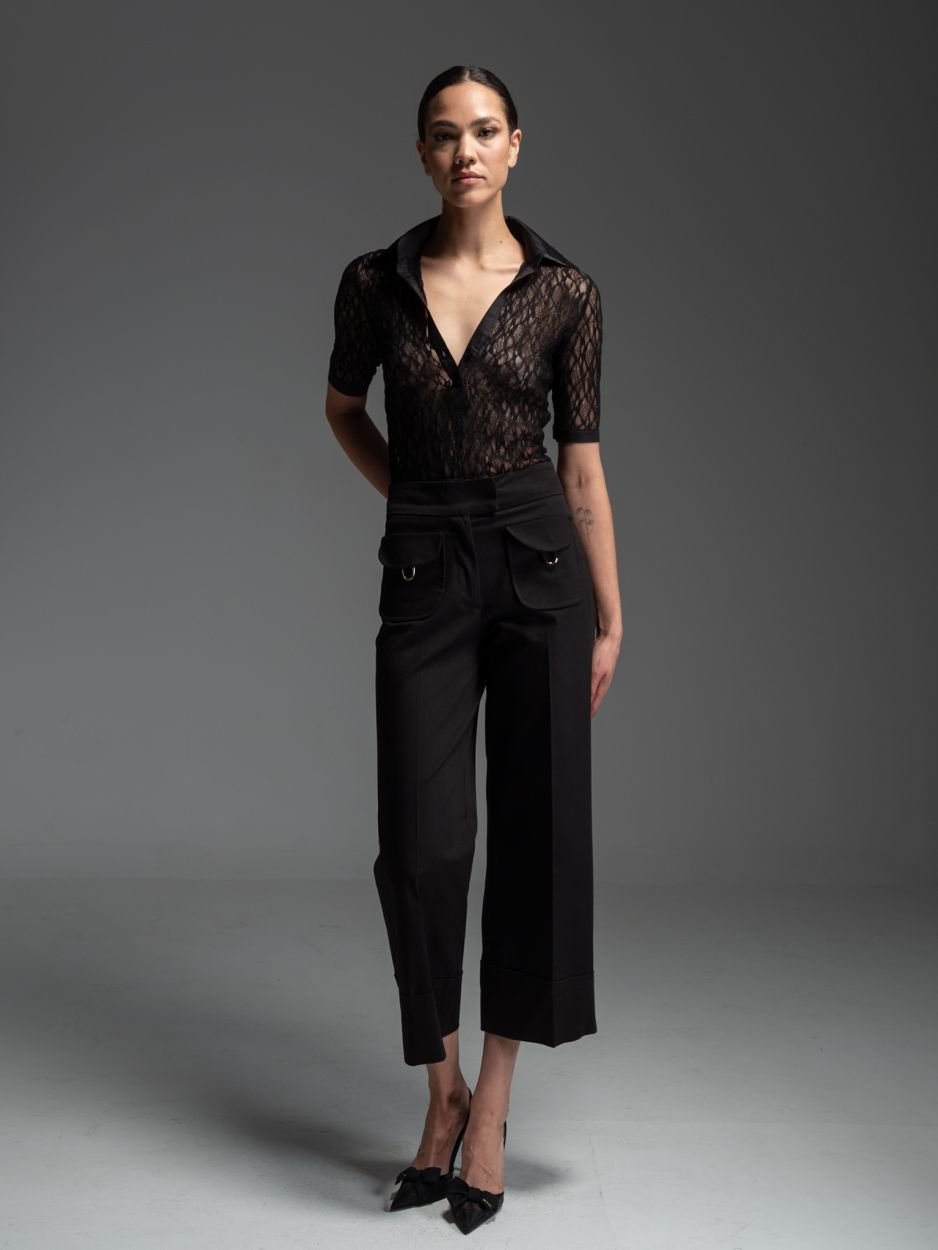 Pants Μαύρο παντελόνι κάπρι από βαμβακερό ύφασμα με μικρή ελαστικότητα, σχεδιασμένο για άνετη εφαρμογή και κομψή, θηλυκή σιλουέτα. Διαθέτει ζωνάρι στη μέση, μεταλλικές κόπιτσες και κλείσιμο με φερμουάρ, προσφέροντας σταθερή εφαρμογή και προσεγμένο τελείωμα. Οι εξωτερικές τσέπες μπροστά και πίσω, μαζί με τα μεταλλικά διακοσμητικά στοιχεία στις μπροστινές τσέπες, χαρίζουν έναν ιδιαίτερο και σύγχρονο χαρακτήρα στο σχέδιο. Το ρεβέρ στο τελείωμα ολοκληρώνει το κομμάτι με refined αισθητική, ενώ η γραμμή του είναι εξαιρετικά κολακευτική και κομψή.