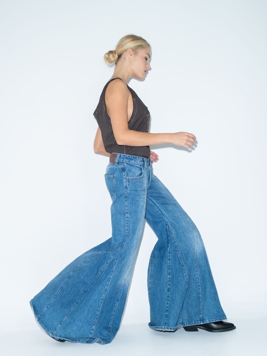 Μπλε τζιν παντελόνι με υπέροχη επεξεργασία στο πλύσιμο που του χαρίζει μοναδική απόχρωση και vintage υφή. Χαμηλόμεσο, πεντάτσεπο, με εντυπωσιακή φαρδιά καμπάνα, μεταλλικό φερμουάρ και κουμπί μπροστά.