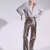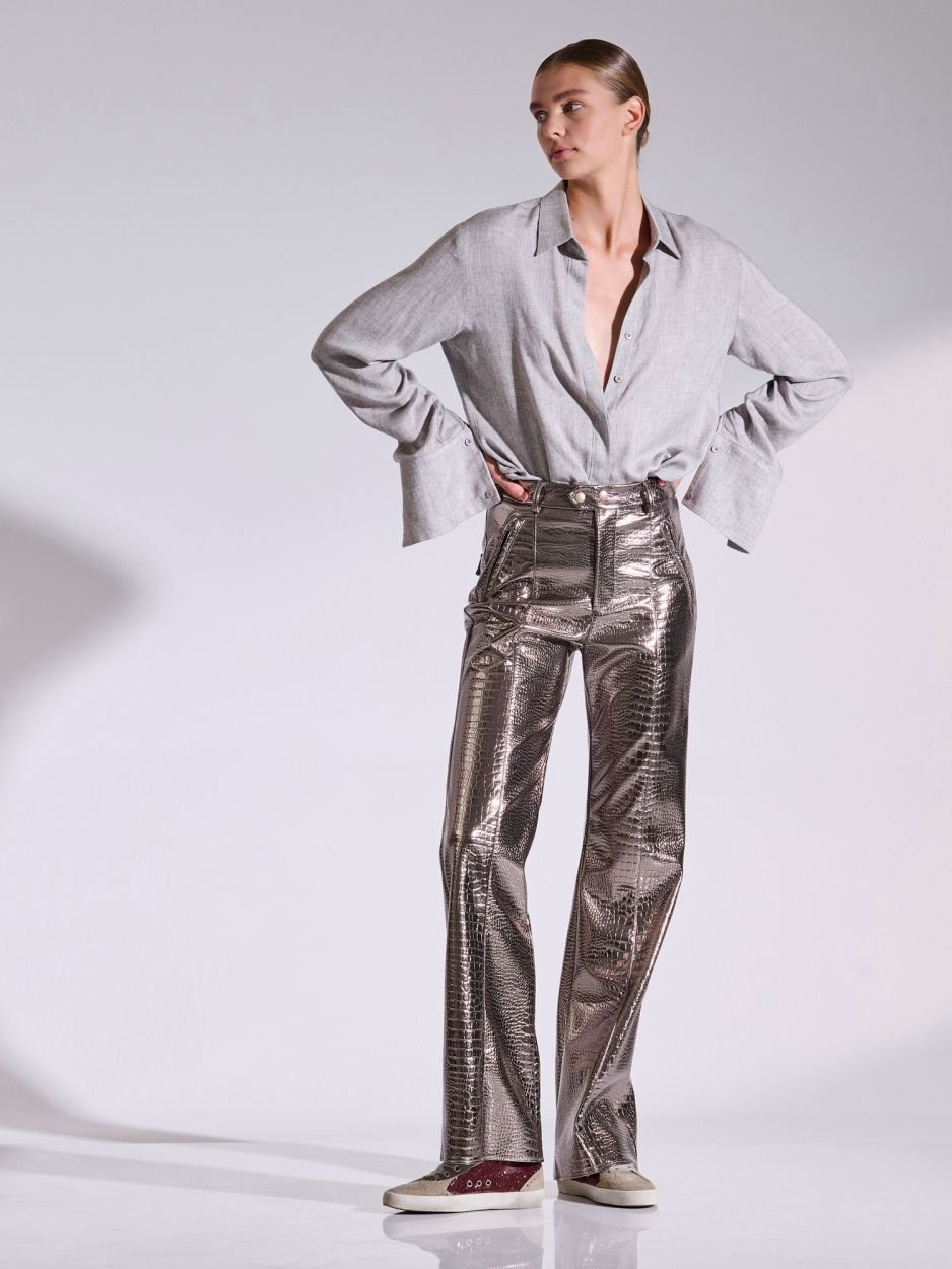 Παντελόνι ψηλόμεσο από ασημί οικολογικό δέρμα κροκό που συνδυάζει στυλ και άνεση, κατάλληλο για πολλές περιστάσεις. Διαθέτει ελαστικότητα, τσέπες με μεταλλικά φερμούρ, διακοσμητικές τσέπες πίσω, και κλείνει μπροστά με φερμουάρ και τρουκς. Συνδυάστε το με λευκό πουκάμισο και αθλητικά σνίκερς για casual look. Φορέστε το με λευκό φανελάκι και ψηλές γόβες, προσθέτοντας ένα μακρύ πάνωφορο για ροκ στυλ.