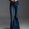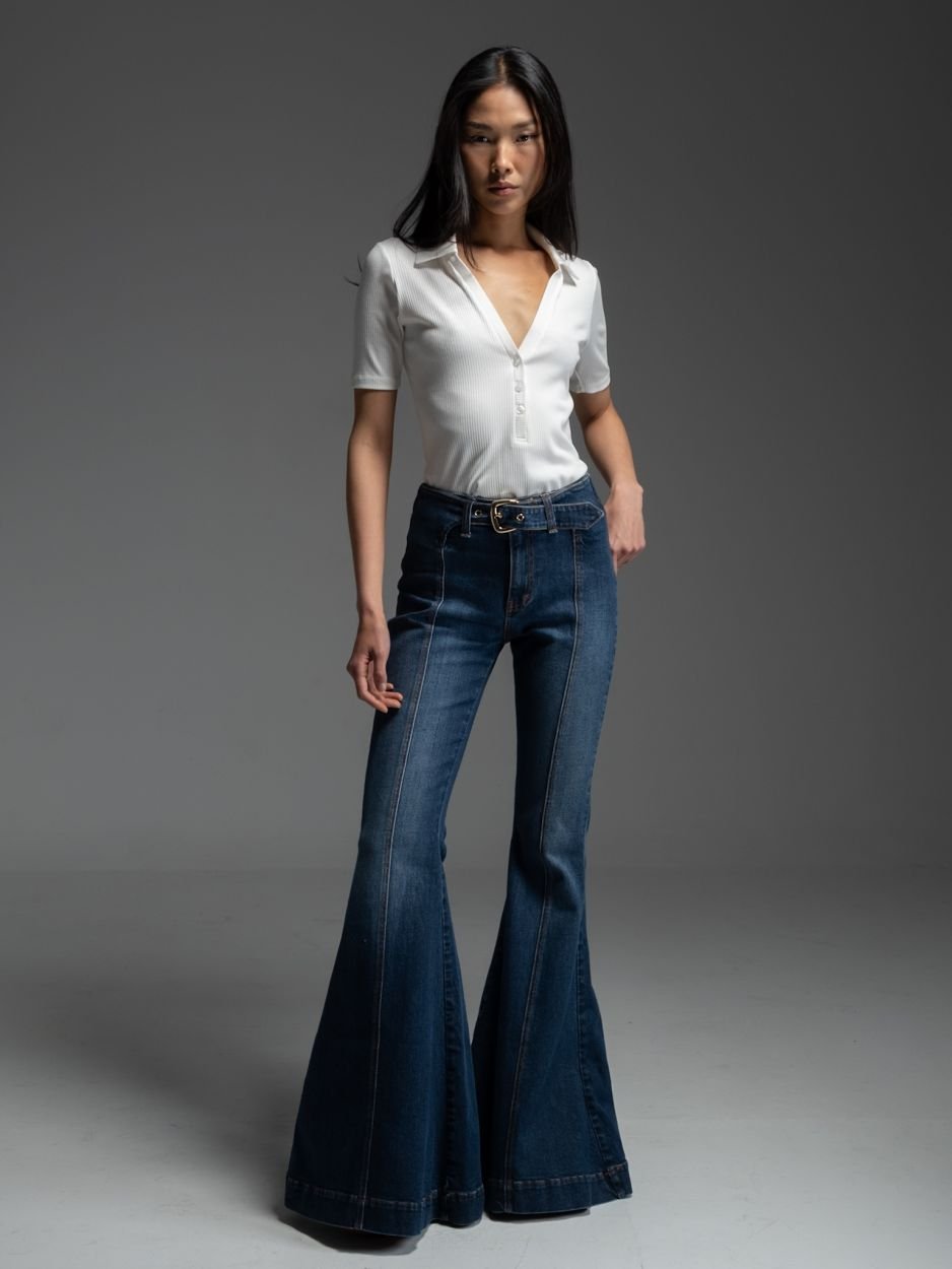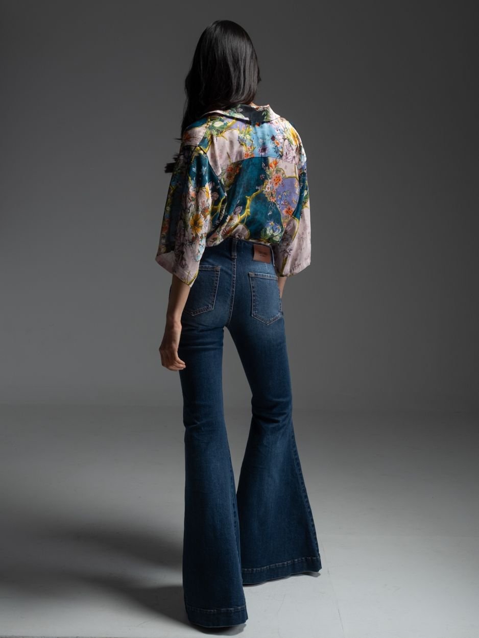 Τζιν παντελόνι σε μπλε απόχρωση, σε εντυπωσιακή ψηλόμεση καμπάνα γραμμή, σχεδιασμένο να αναδεικνύει τη σιλουέτα και να προσφέρει ένα ιδιαίτερα θηλυκό και δυναμικό αποτέλεσμα.