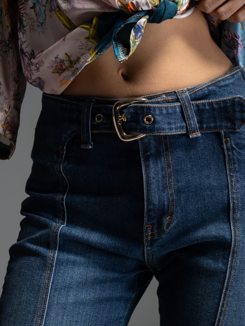 Ξεχωρίζει για το ιδιαίτερο ζωνάρι με μεταλλική χρυσή αγκράφα, που δίνει στο σχέδιο έναν πιο elevated και fashion χαρακτήρα, ενώ το μεταλλικό φερμουάρ μπροστά ολοκληρώνει τη denim αισθητική του κομματιού.