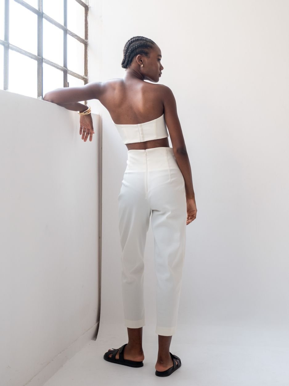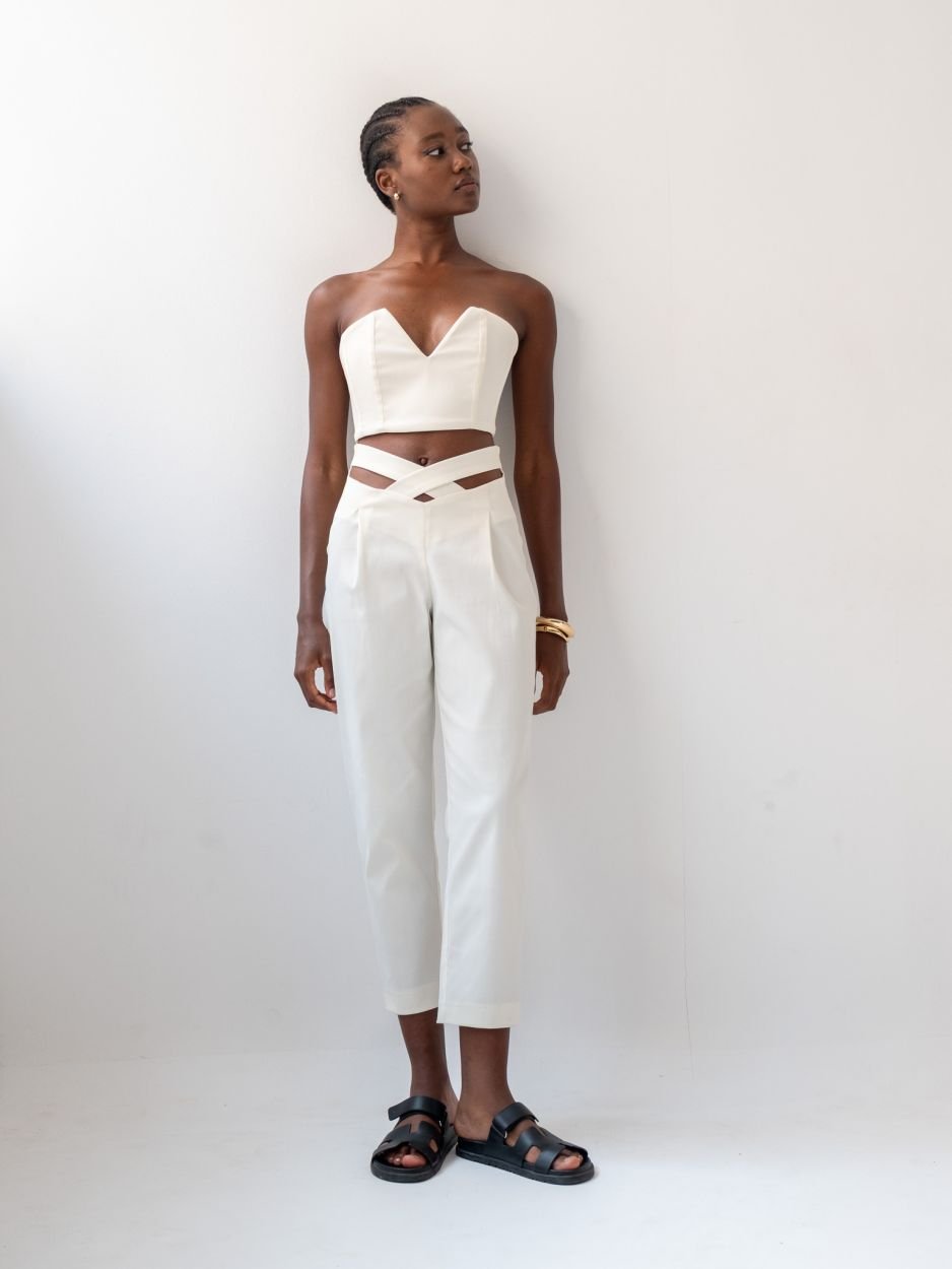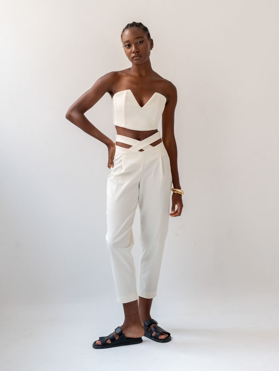 Παντελόνι που απογειώνει τη σιλουέτα και προσθέτει χαρακτήρα στο κάθε σου βήμα. Το ψηλόμεσο σχέδιο με χιαστή λεπτομέρεια στη μέση αγκαλιάζει το σώμα με θηλυκότητα. Εντυπωσιακό χιαστό κόψιμο στο μπροστινό μέρος της μέσης Κλείσιμο με διακριτικό φερμουάρ στο πίσω μέρος . Στενή γραμμή προς τα κάτω, που αναδεικνύει τα πόδια . Από ύφασμα που προσφέρει σταθερότητα και εφαρμογή. Το structured fit εφαρμόζει τέλεια στη λεκάνη και ανοίγει ελαφρώς προς τα κάτω, καταλήγοντας σε cropped τελείωμα στους αστραγάλους. Το ύφασμα έχει σατινέ υφή, προσθέτοντας μια αίσθηση διακριτικής πολυτέλειας. Ένα δυναμικό αλλά κομψό κομμάτι, ιδανικό για day-to-night εμφανίσεις.