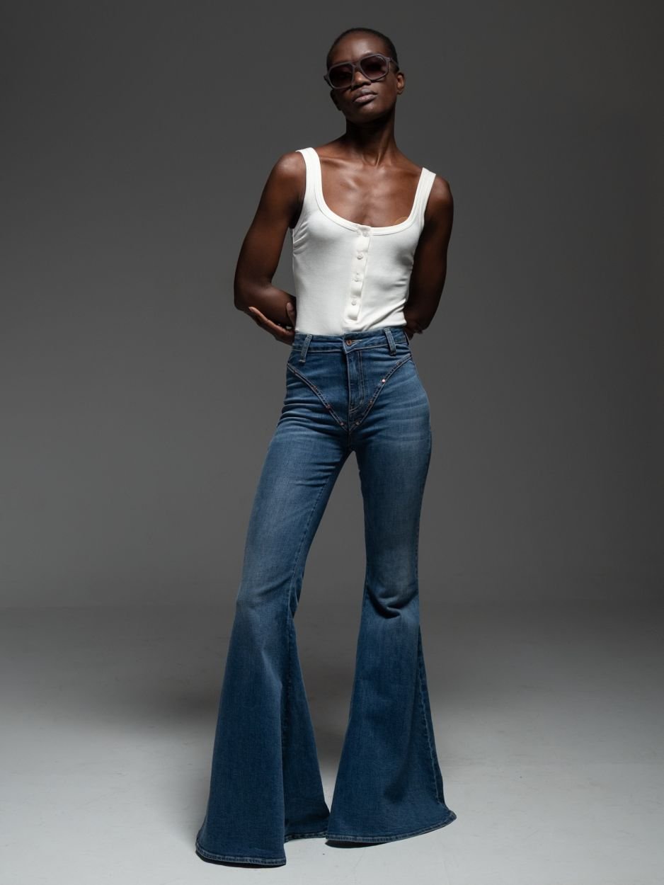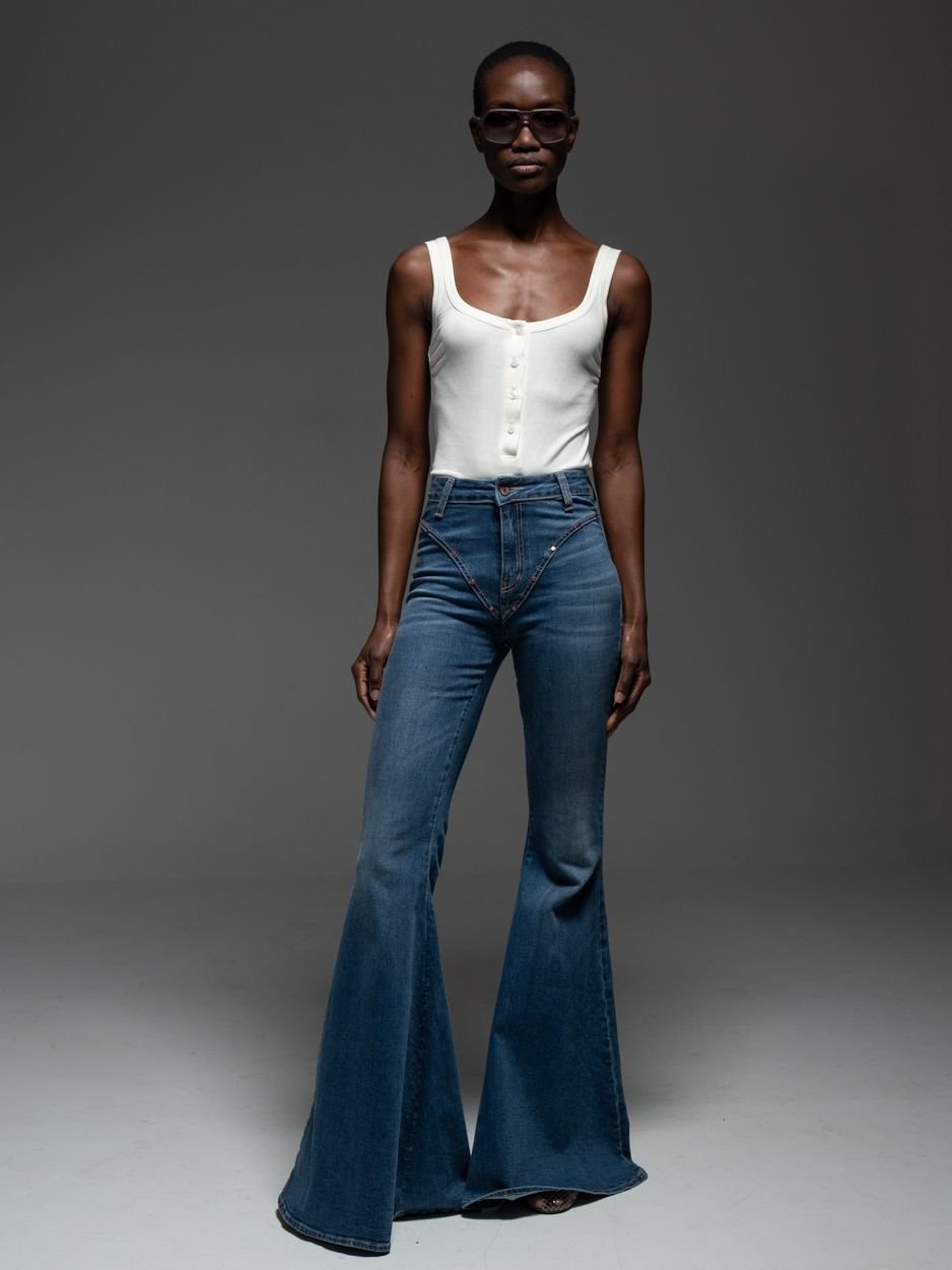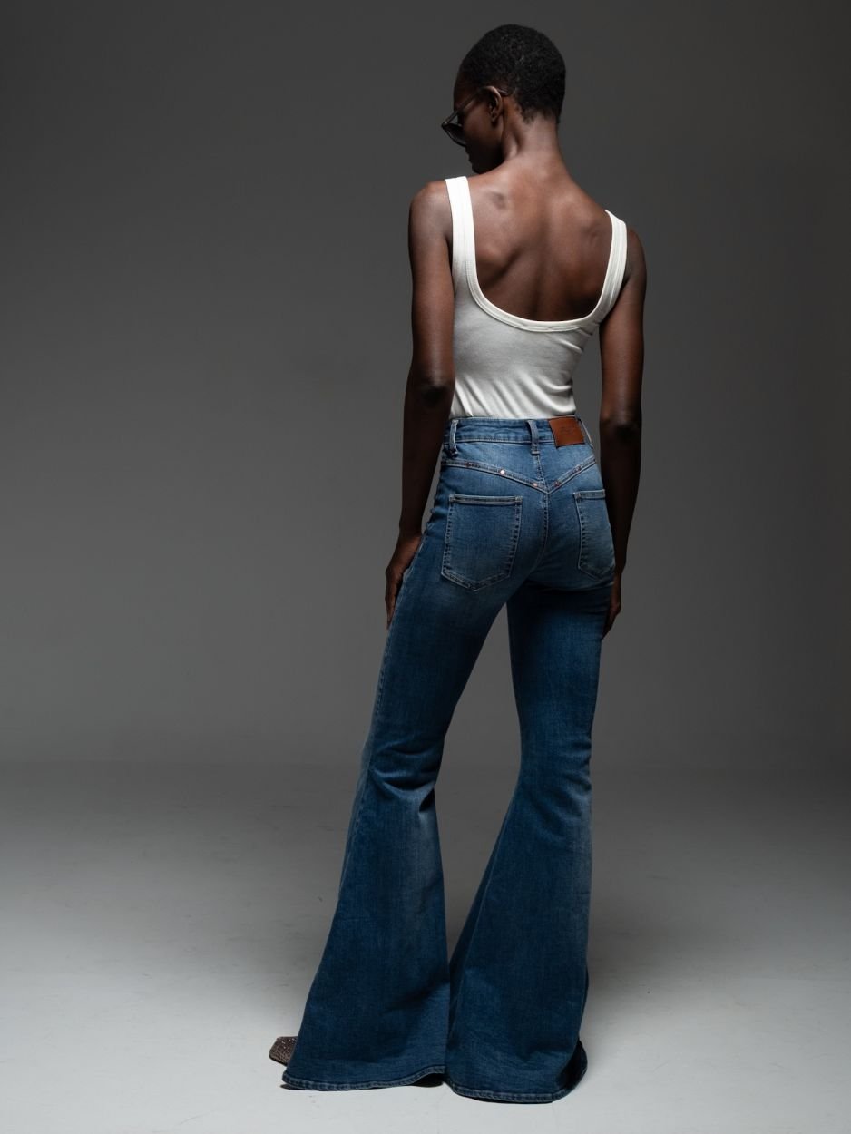 Τζιν παντελόνι σε μπλε απόχρωση, σε εντυπωσιακή καμπάνα γραμμή και πεντάτσεπο σχέδιο, σχεδιασμένο για να αγκαλιάζει το σώμα και να δημιουργεί μία ιδιαίτερα θηλυκή και κολακευτική σιλουέτα.