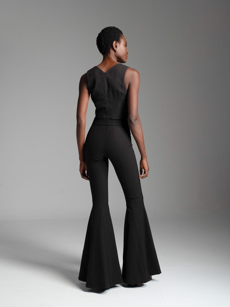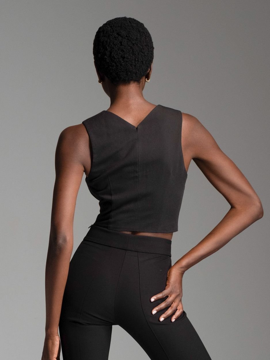 Κροπ τοπ αμάνικο με θηλυκό V στο ντεκολτέ, από κρεπ ύφασμα με μικρή ελαστικότητα και διπλή επένδυση για σταθερό κράτημα και κάλυψη. Διαθέτει αόρατο φερμουάρ στο πλάι για εύκολη εφαρμογή. Αναδεικνύει όμορφα τους ώμους και προσφέρει δροσερή αίσθηση στο σώμα. Συνδυάστε το με ψηλόμεσο μαύρο παντελόνι, μαύρη ψηλόμεση φούστα ή σορτς για ένα all-black chic look, ιδανικό τόσο για βραδινές εμφανίσεις όσο και για stylish casual σύνολα.