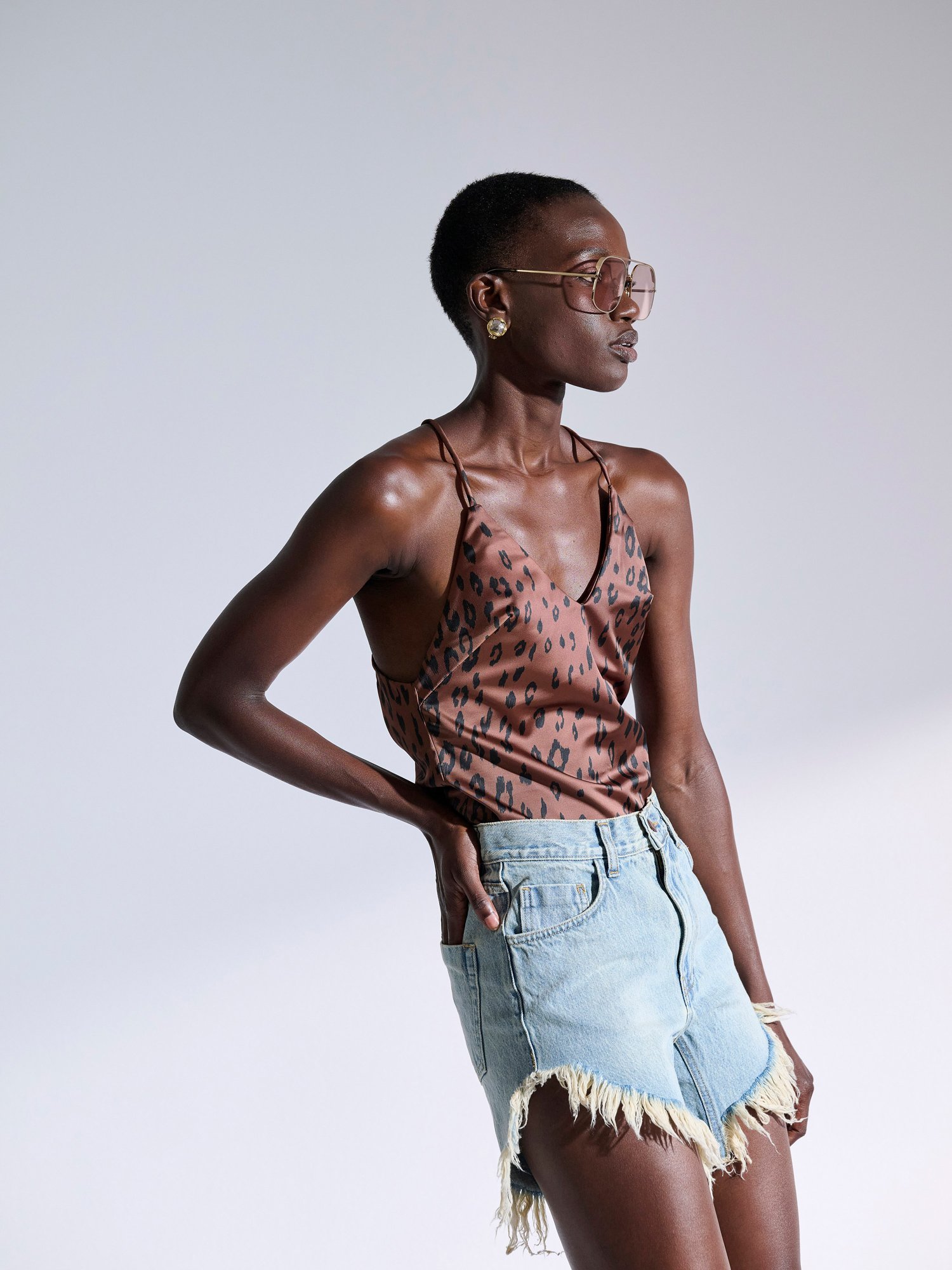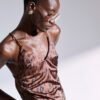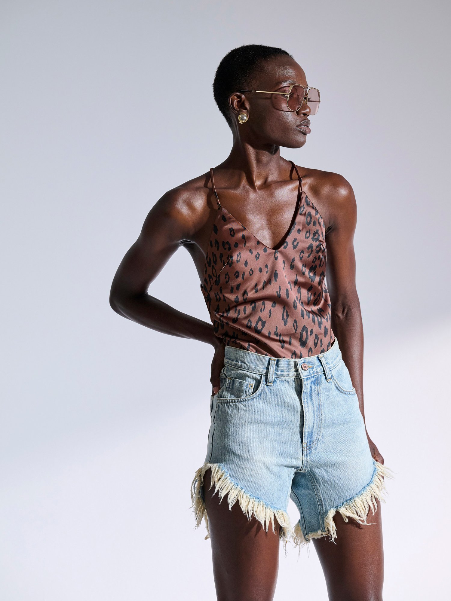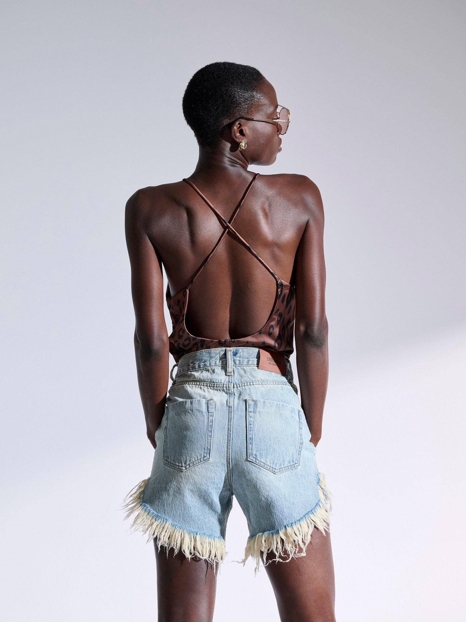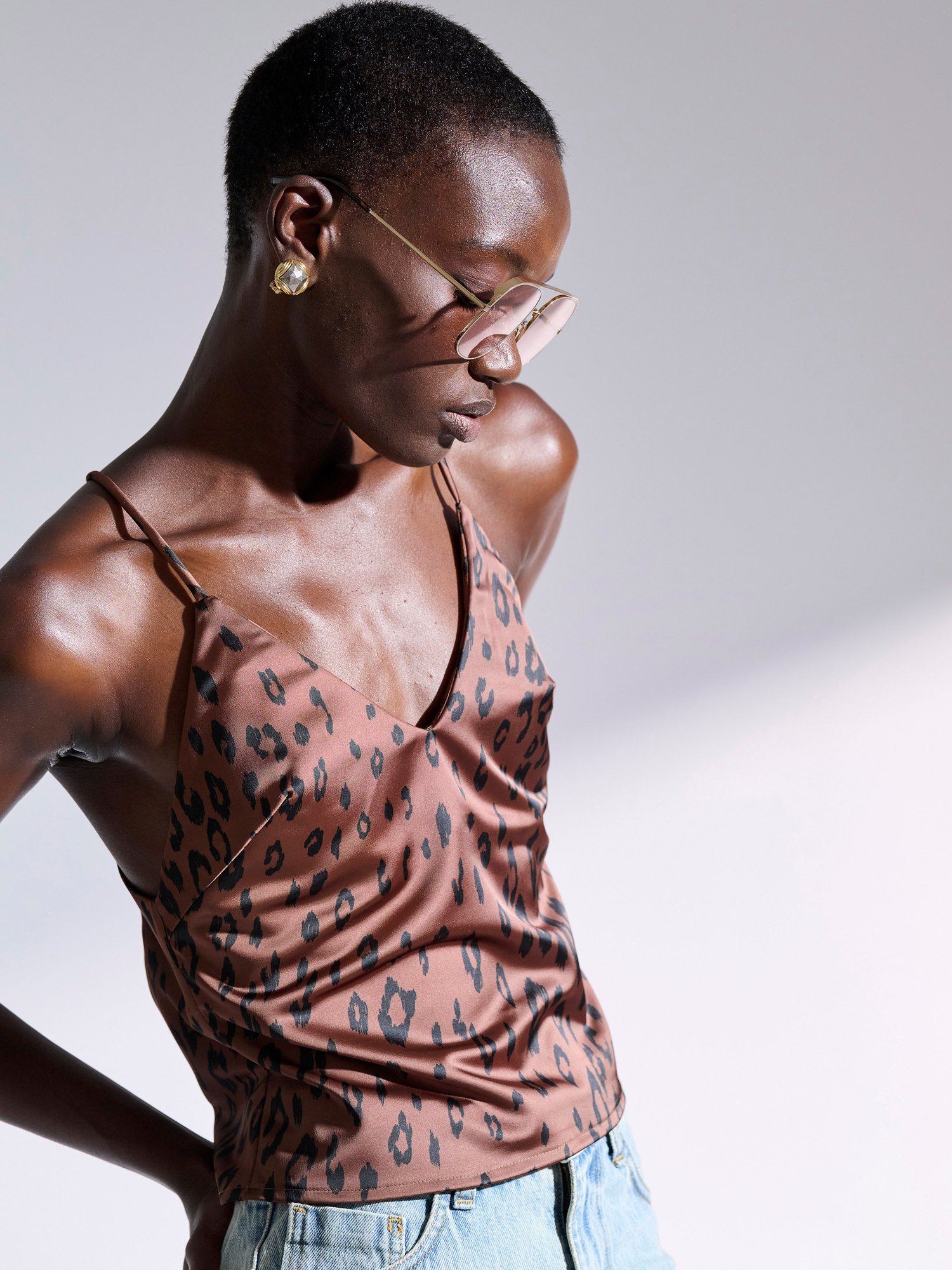 Λεοπάρ τοπ με ανοιχτή πλάτη και χιαστή λεπτές τιράντες στην πλάτη από κρεπ σατέν ελαστικό ύφασμα.