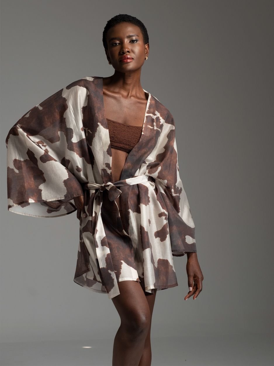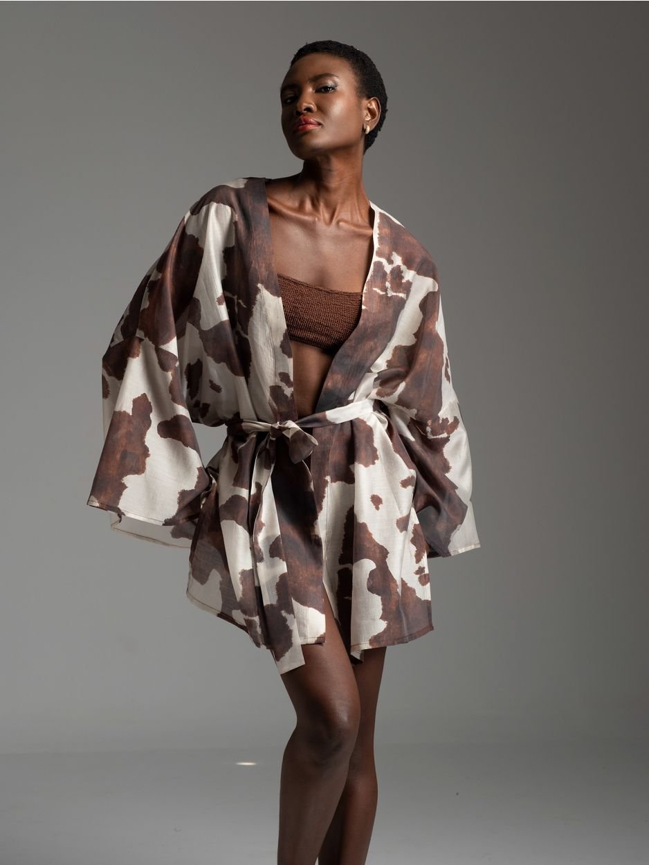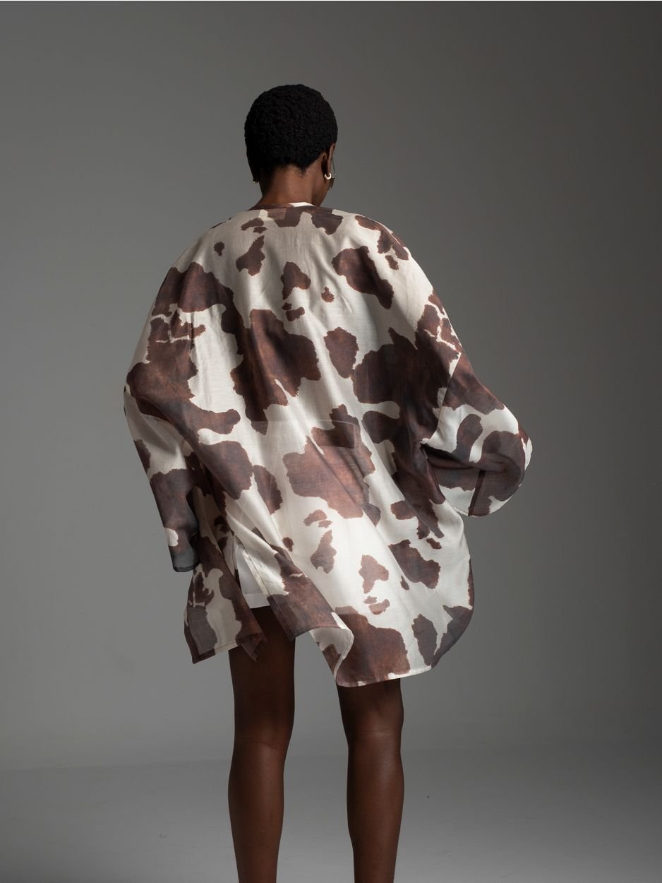 Statement κιμονό σε cow print με ζώνη, έχει μεγάλα αέρινα μανίκια και δροσερό, ανάλαφρο ύφασμα από φυσικές ίνες rayon. Φόρεσέ το σαν φόρεμα, πάνω από μαγιό ή δεμένο σαν πουκάμισο με jeans.