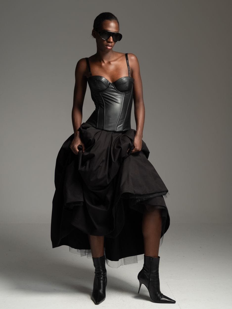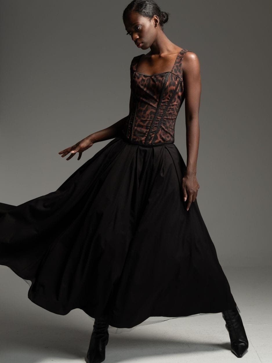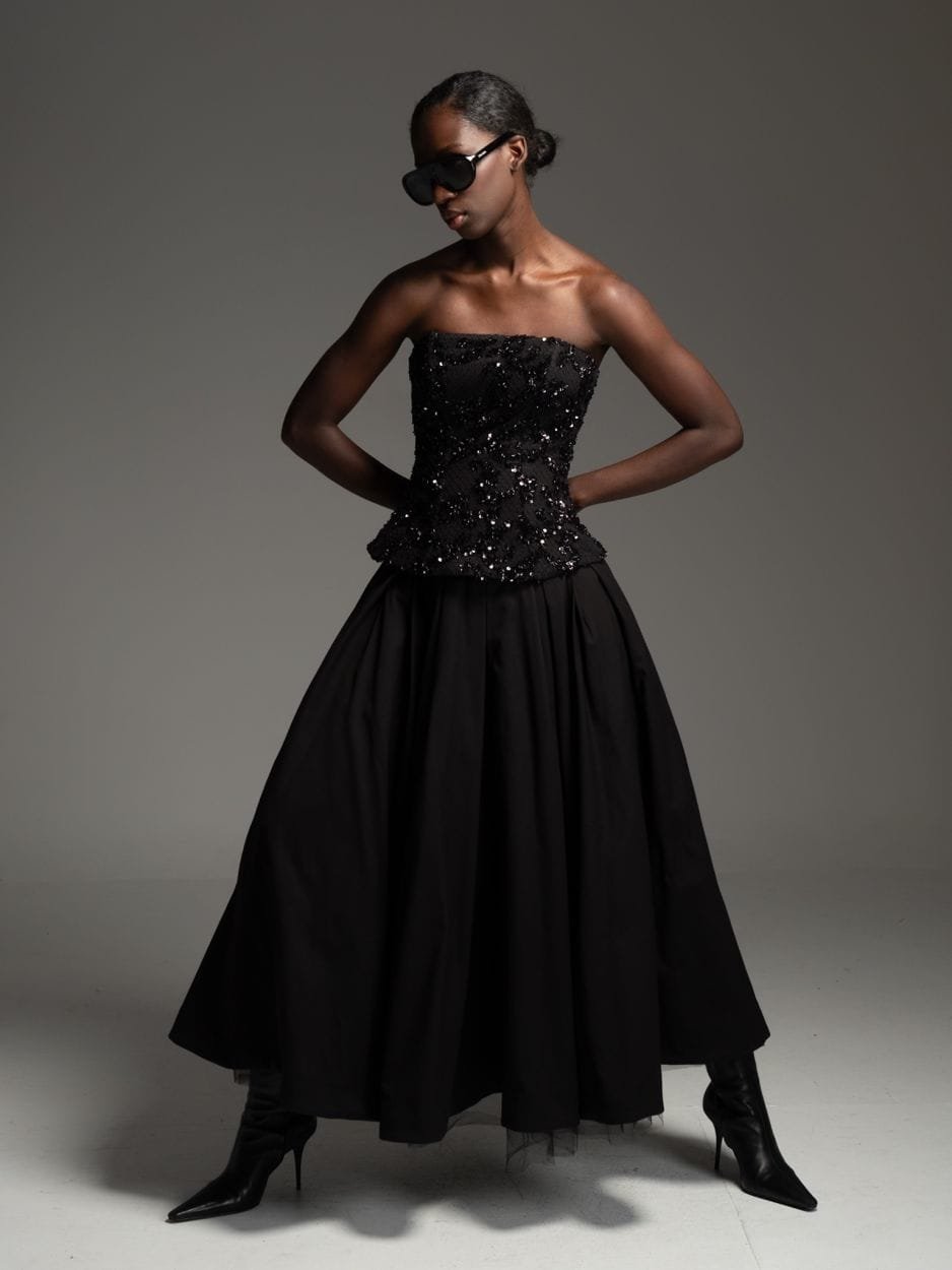 Μακριά μαύρη φαρδιά φούστα με εσωτερικό τούλι και φαρδύ ζωνάρι-κορσέ. Η φούστα έχει μεγάλες, επιβλητικές πιέτες που χαρίζουν κίνηση και όγκο, ενώ το κρυφό φερμουάρ πίσω διατηρεί τη γραμμή της καθαρή και κομψή.