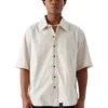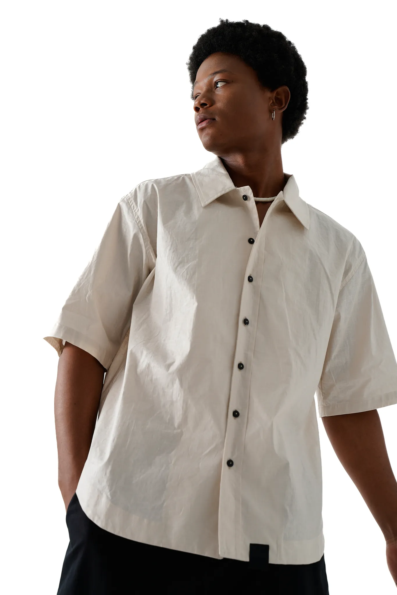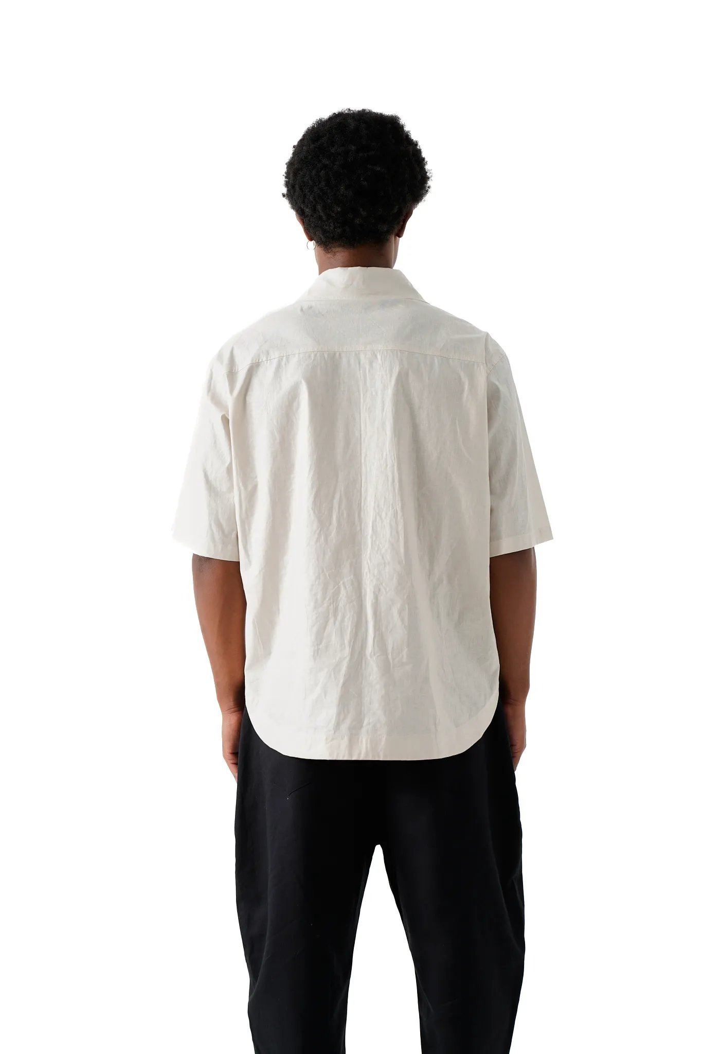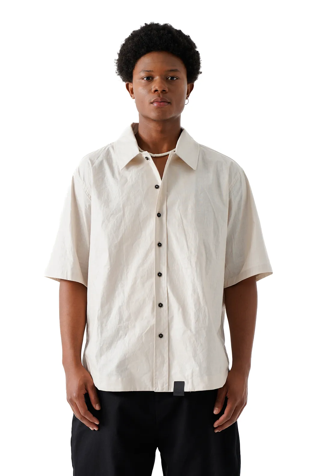 Unisex boxy shirt Boxy-fit collared shirt with short sleeves made of a cotton and bamboo blend. Hem with side vents. Button-up front.