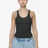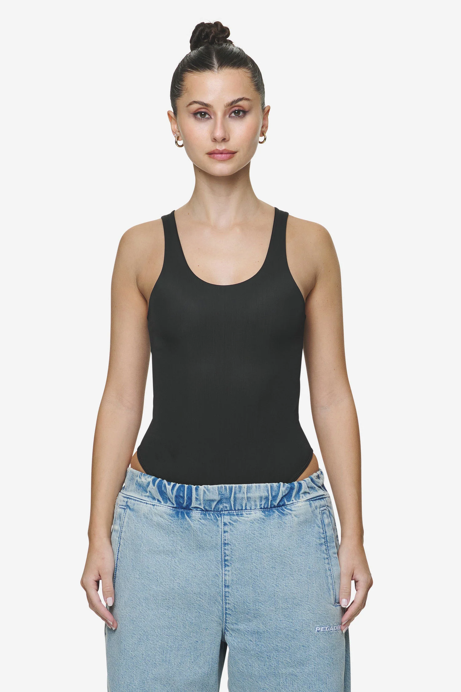 black bodysuit bodycon fit scoop neck white logo print to the back with snap-button closure at the crotch