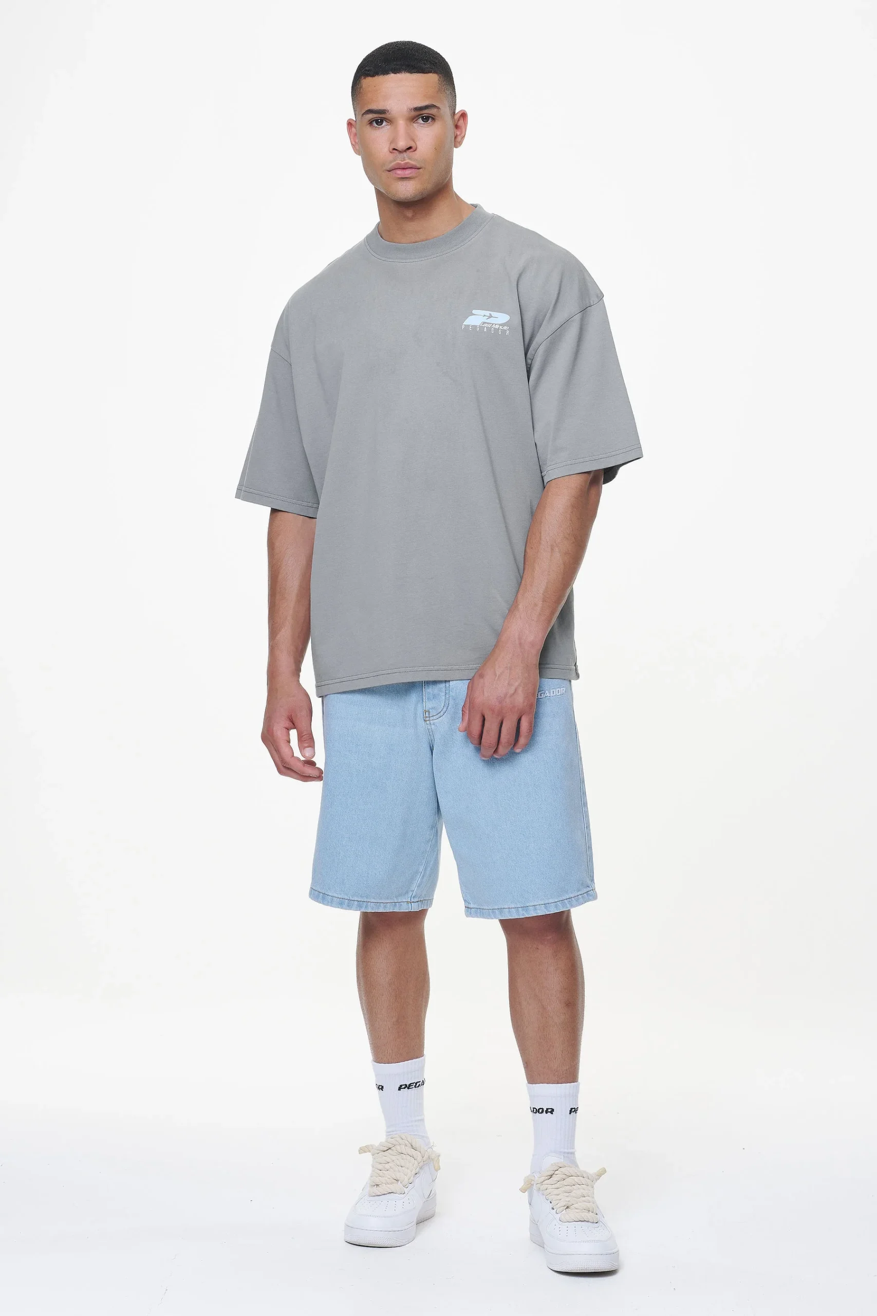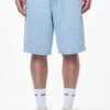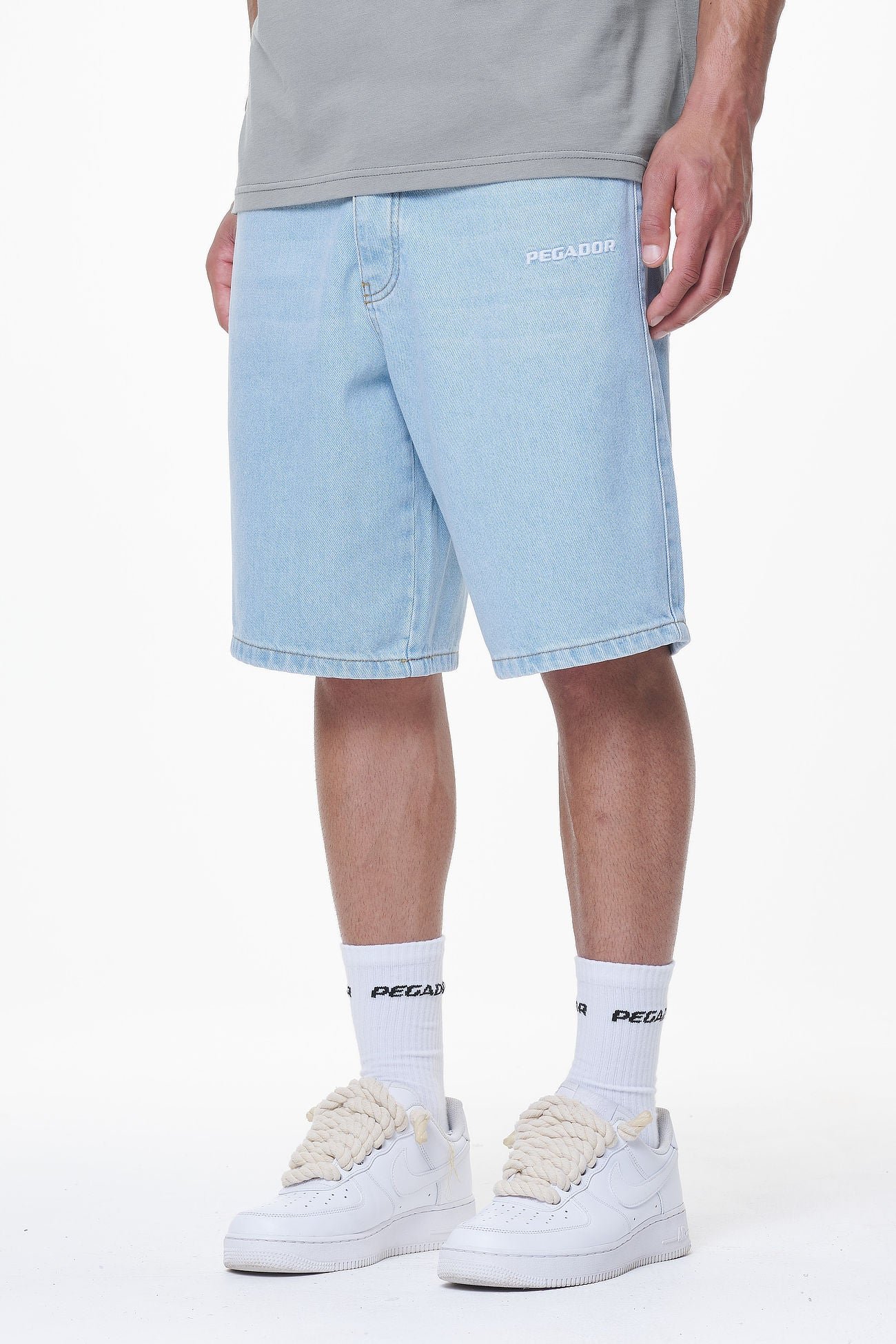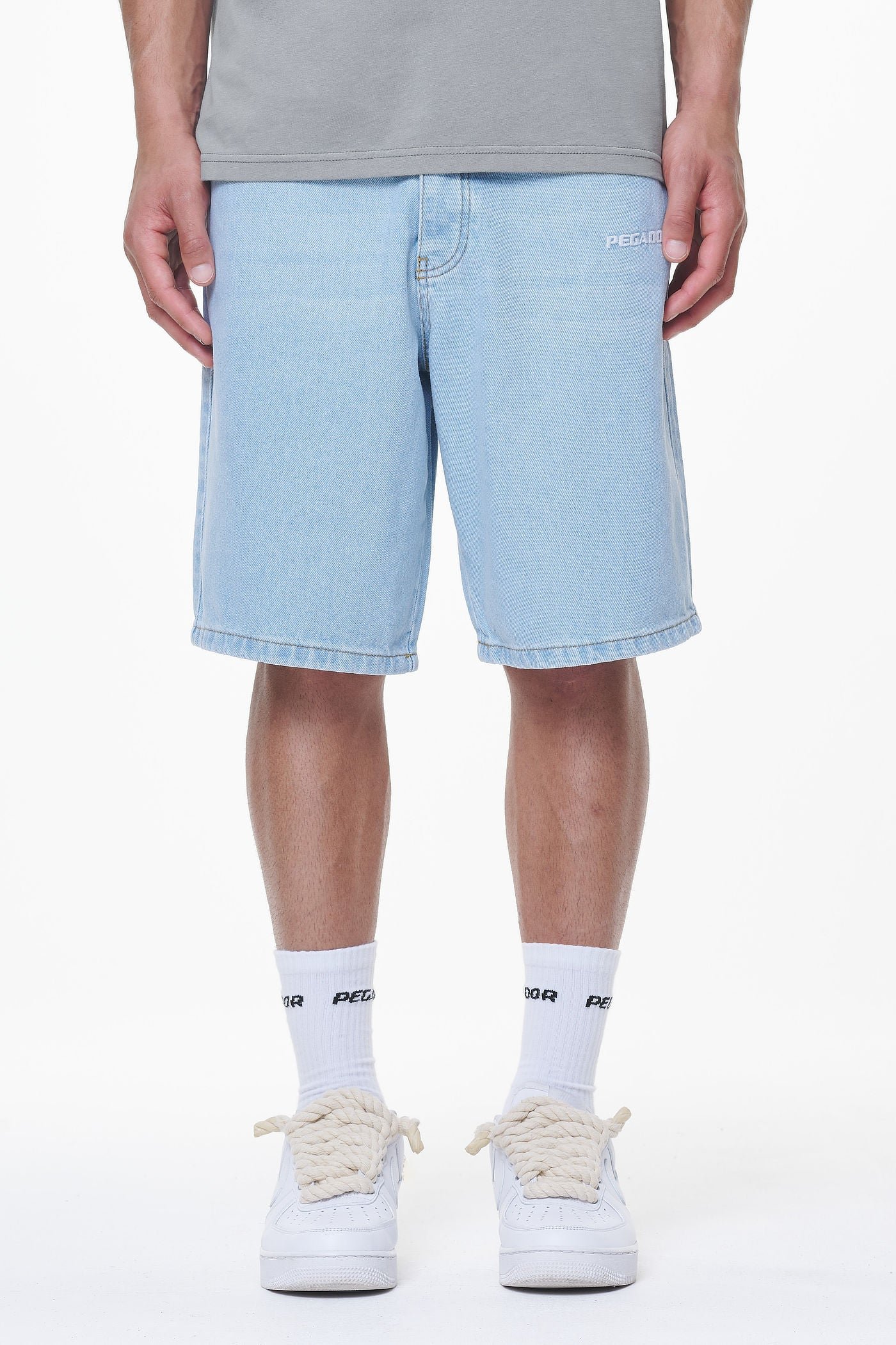washed light blue jeans shorts white logo embroidery to the left leg side pockets logo embossed buttons & rivets