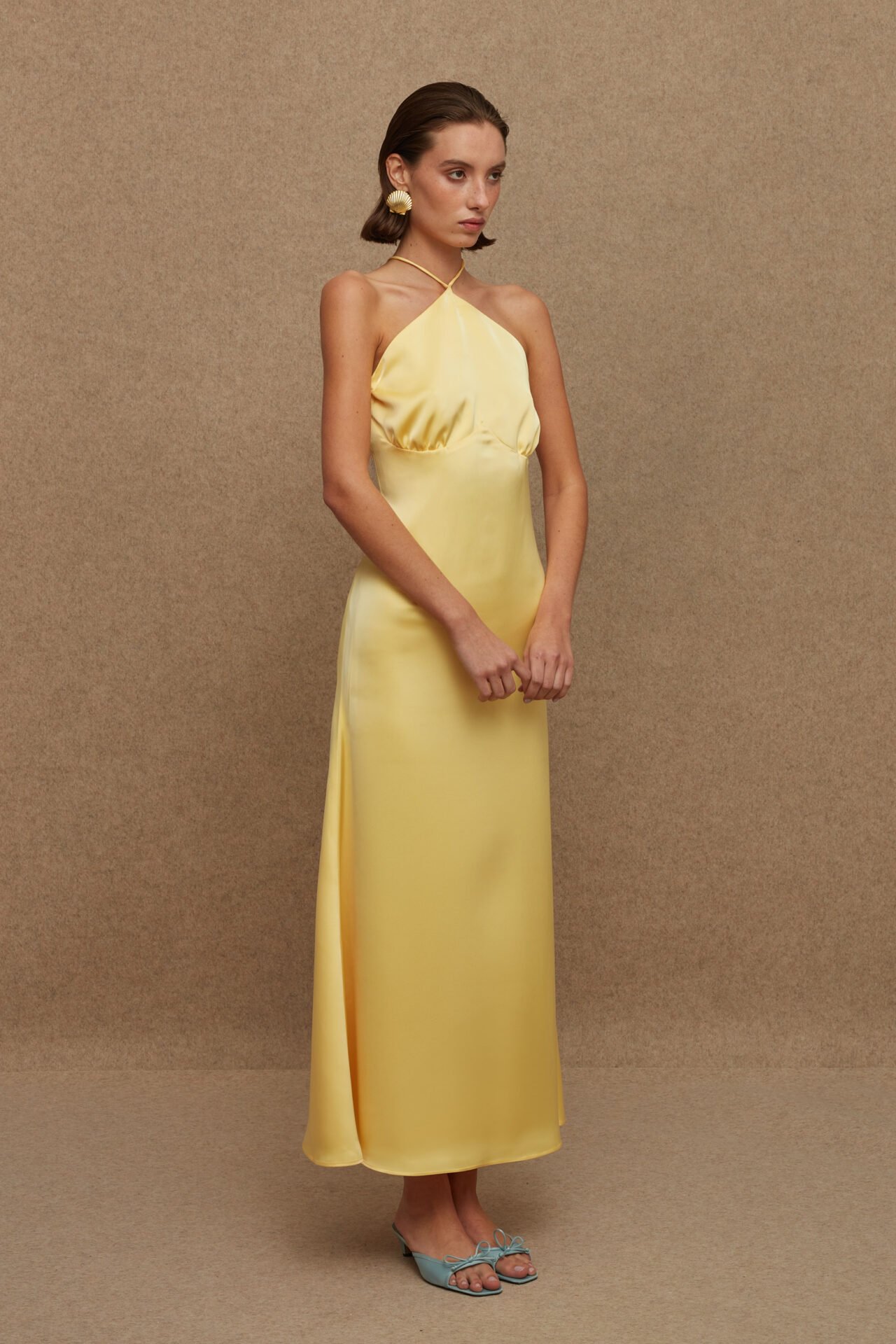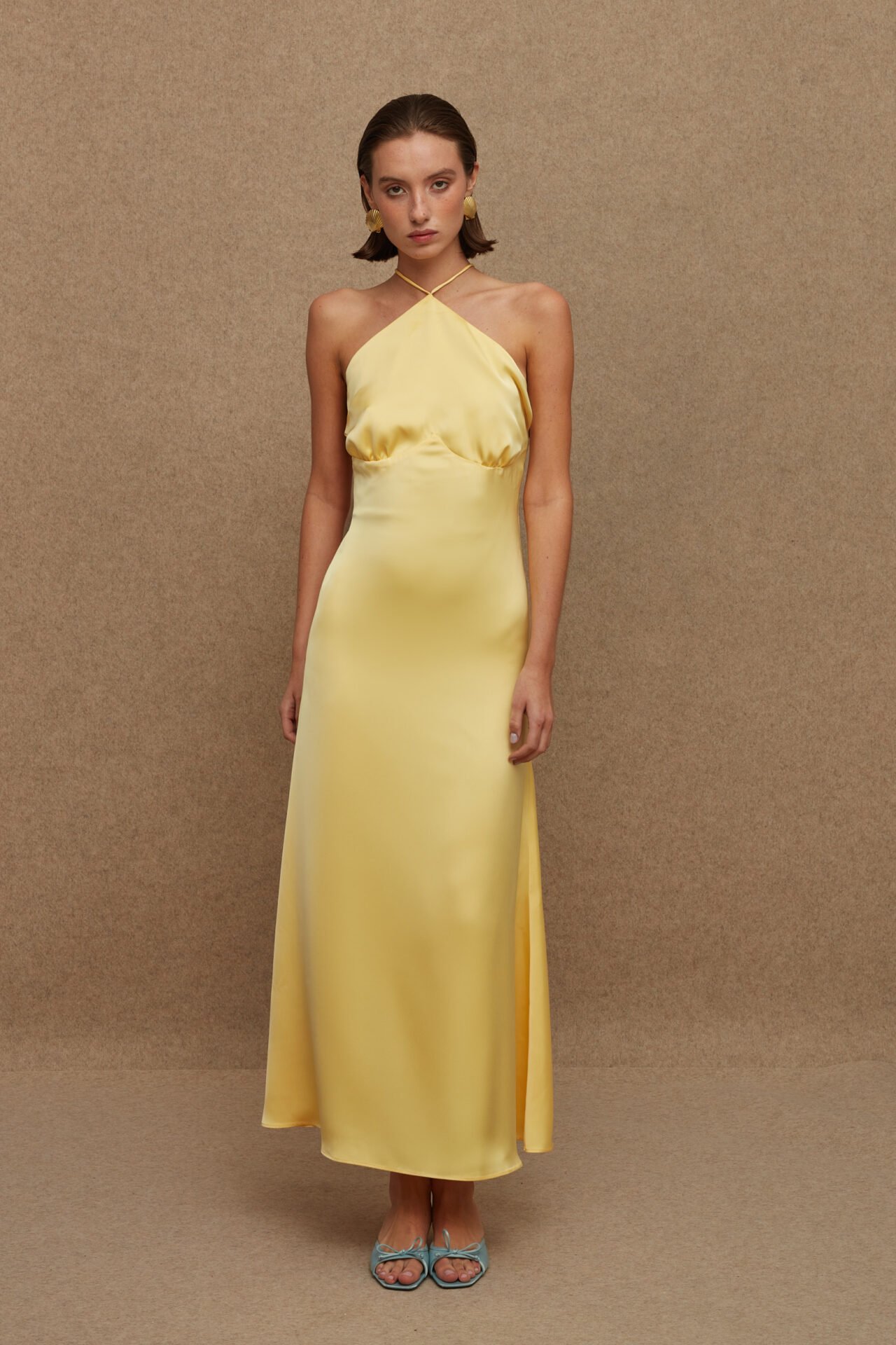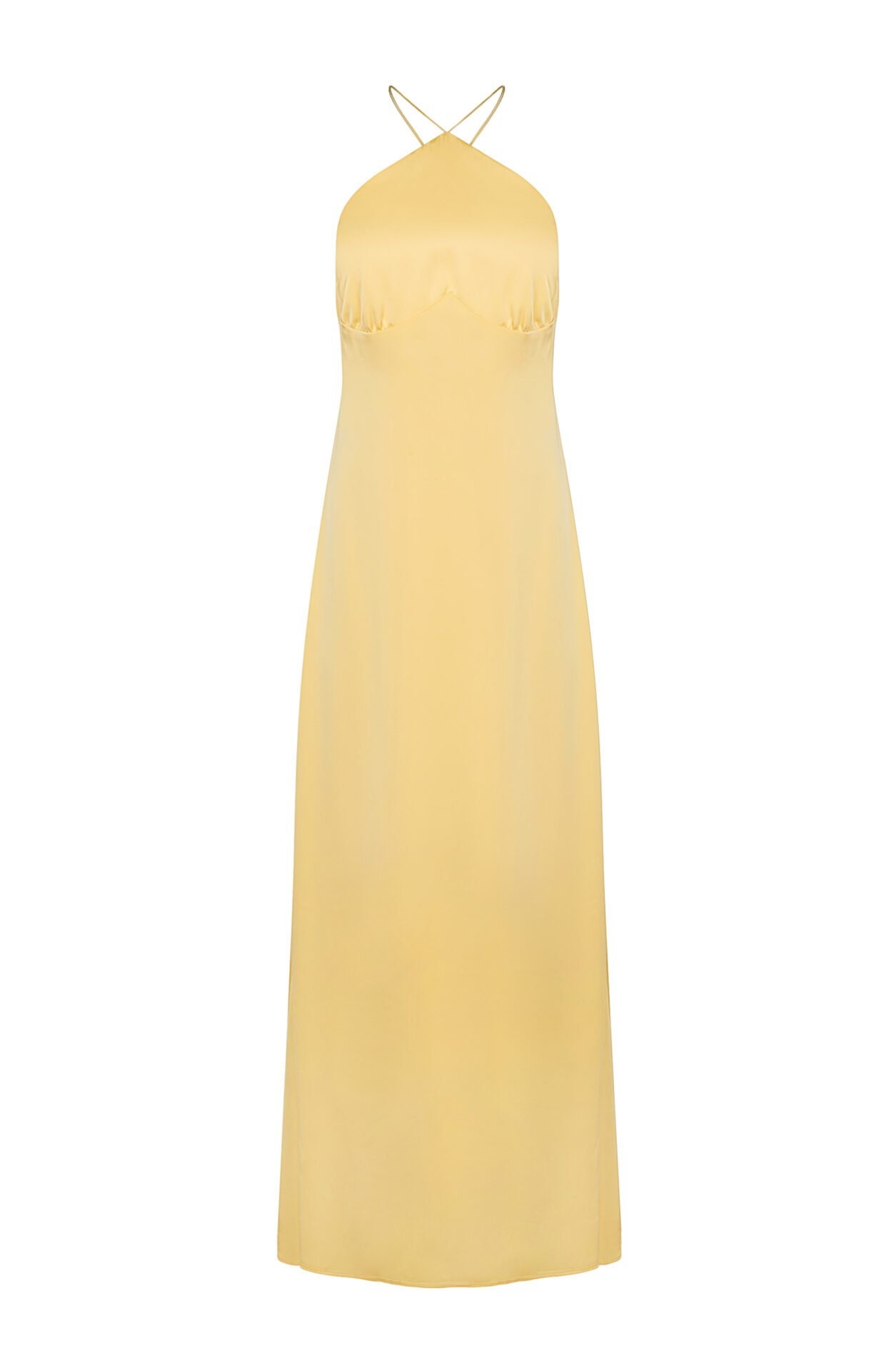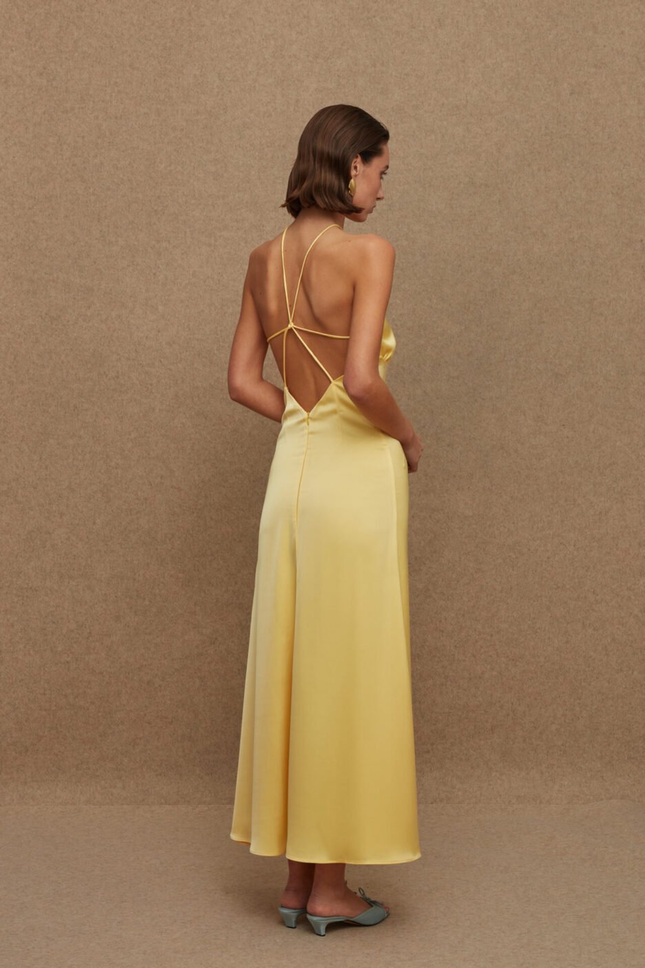 An ankle length slip dress with neck tie & open back.