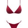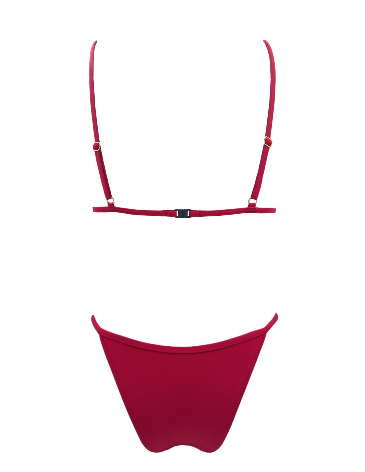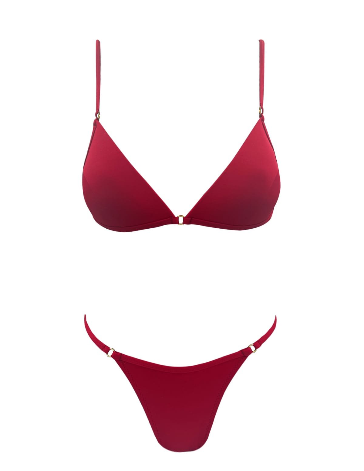 Triangle bikini top with adjustable straps and back hook closure and mid – rise full bikini bottom with small decorative rings.
