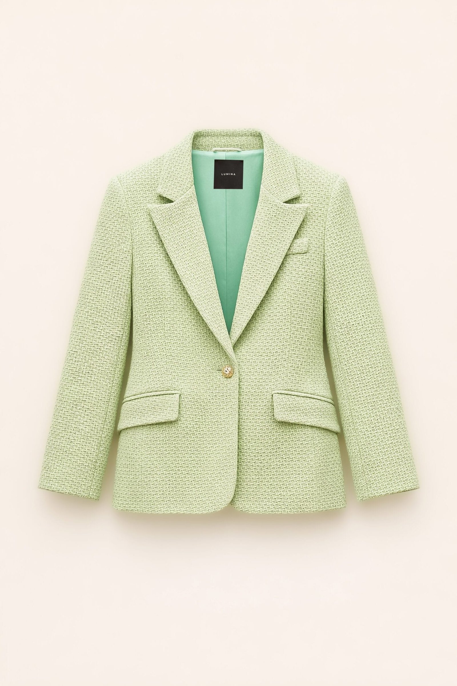Blazer made of cotton blend. Lapel collar and padded shoulders. It features pleats and flap pockets. Front button closure.