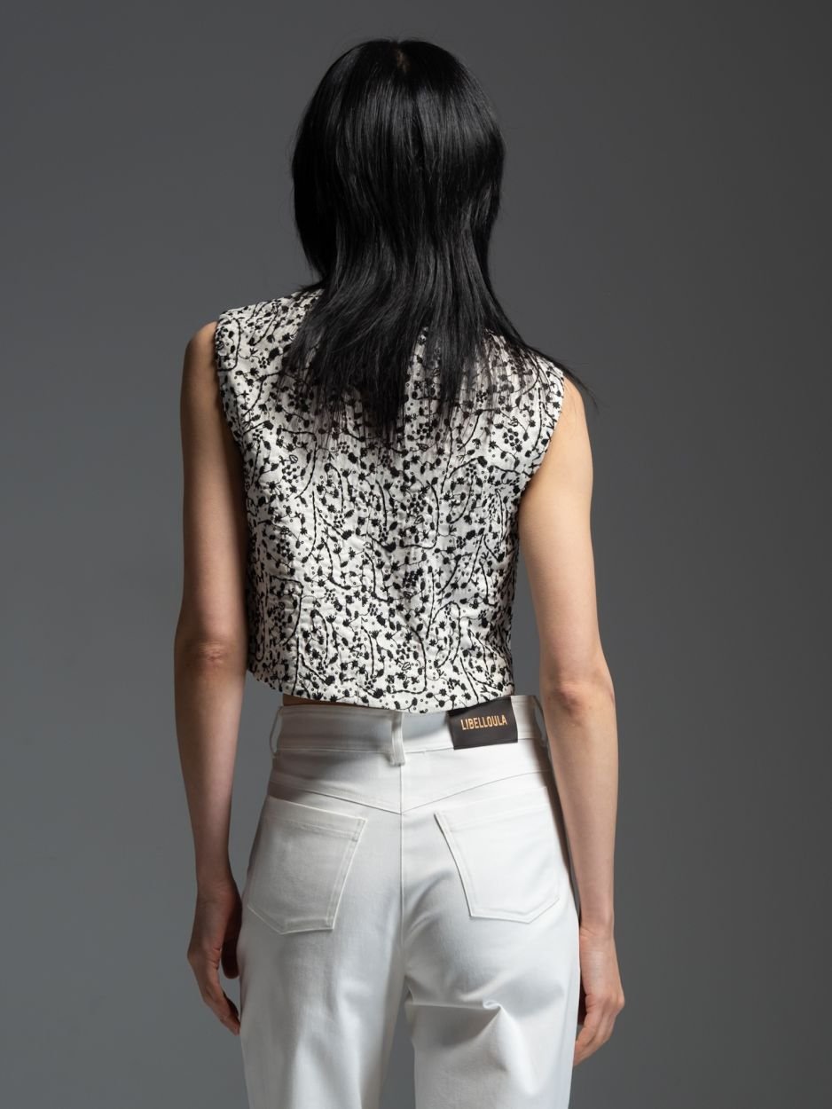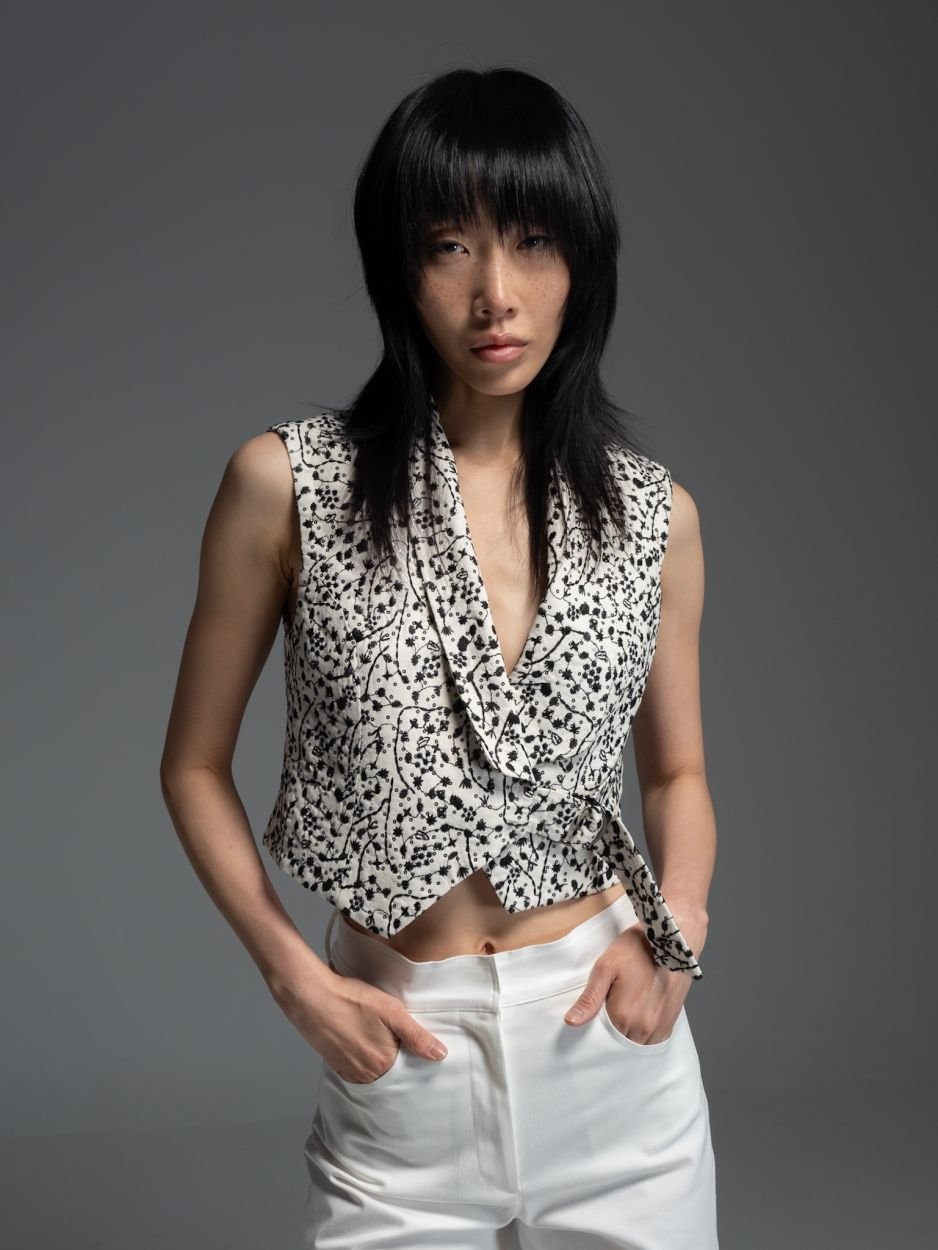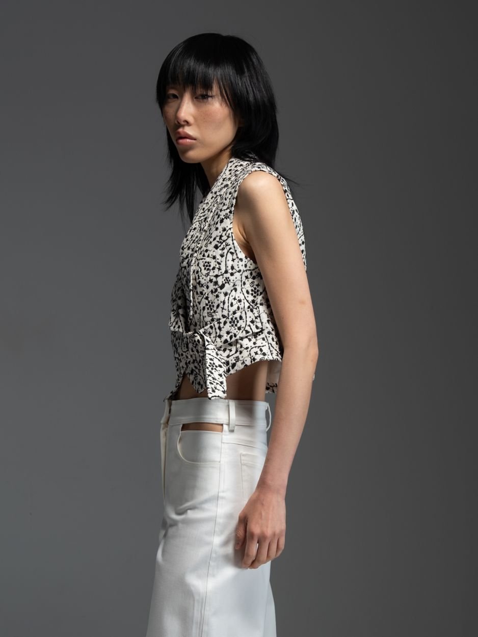 Γιλέκο σε off-white απόχρωση, με κομψή, θηλυκή γραμμή και ιδιαίτερο fashion χαρακτήρα, σχεδιασμένο για εμφανίσεις που ξεχωρίζουν.