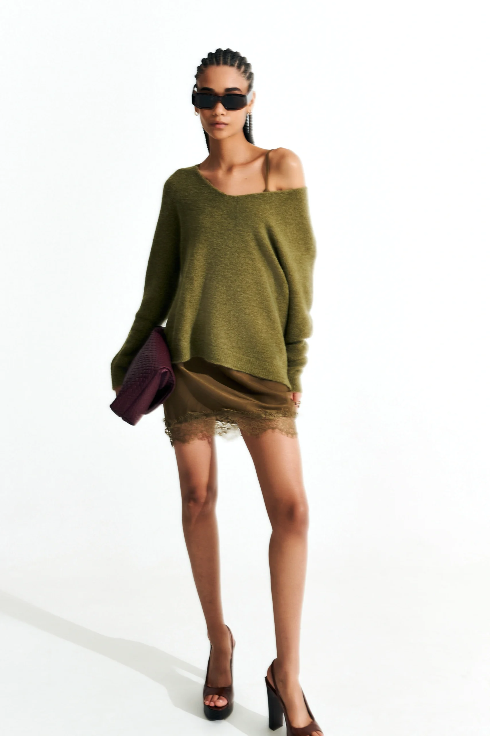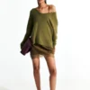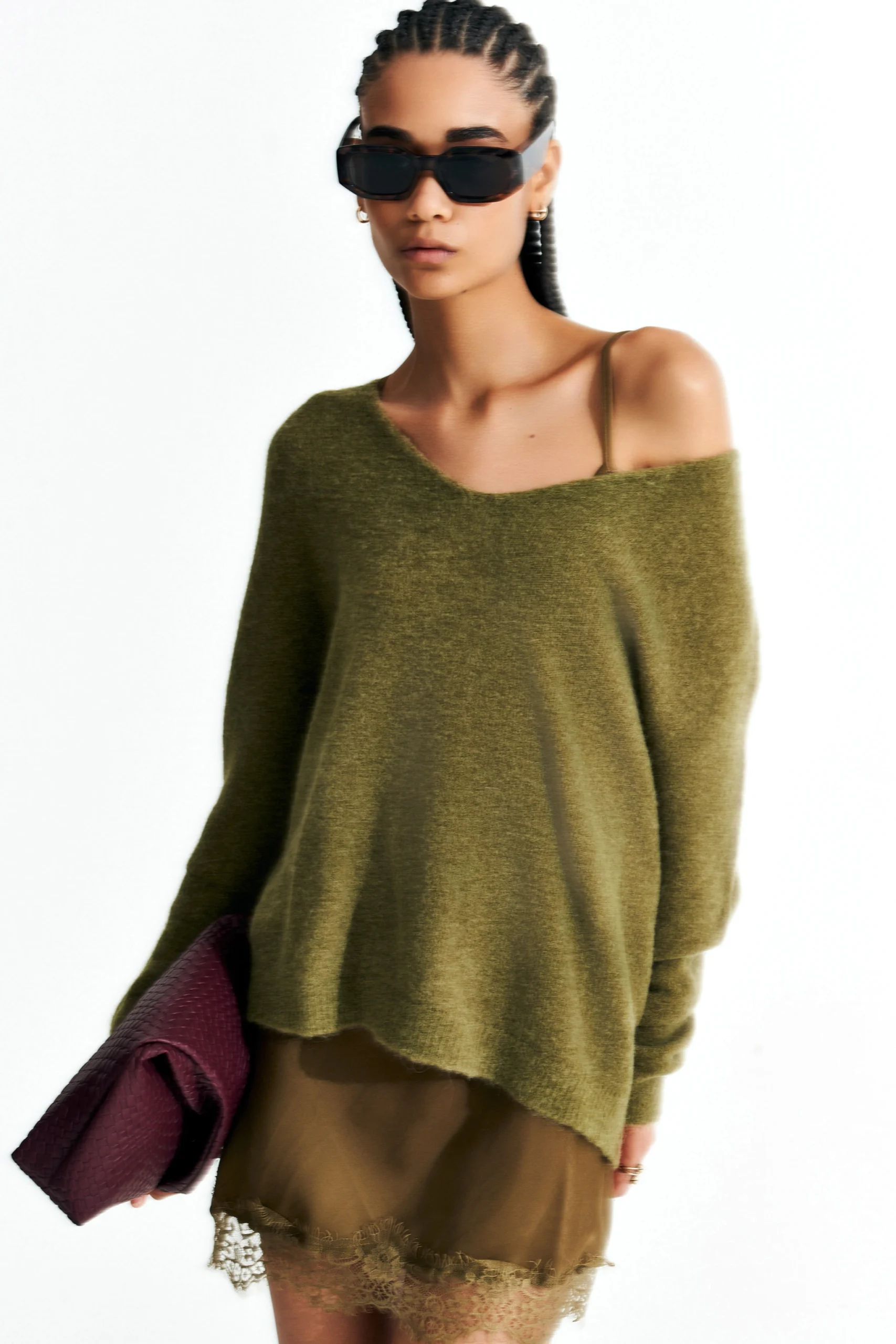 Alpaca blend V-neck sweater. Long sleeves. Features ribbed trims. Dress interior with lace and thin shoulder straps. Soft fit, available in ONE size.