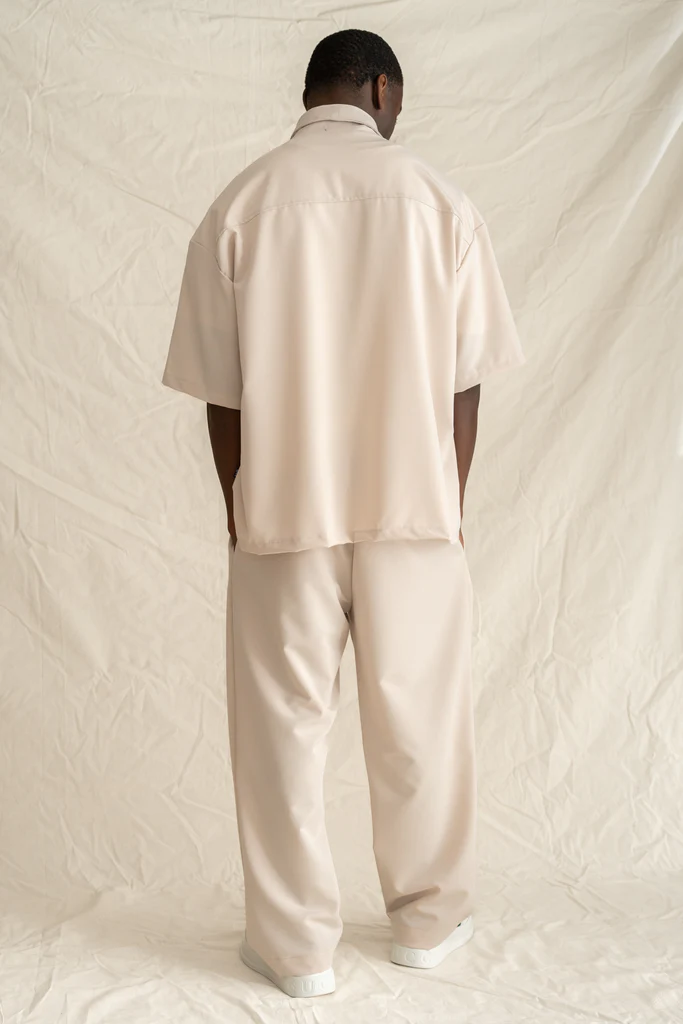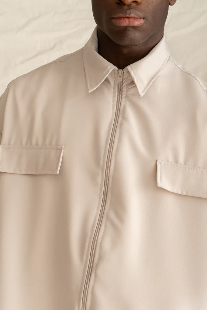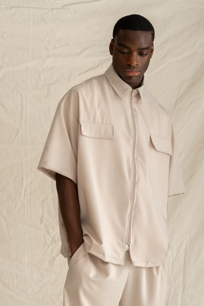 Overshirt κοντομάνικο με φερμουάρ και γιακά. Το μοντέλο είναι 1,85 ύψος , 86kg και φοράει μέγεθος L/XL