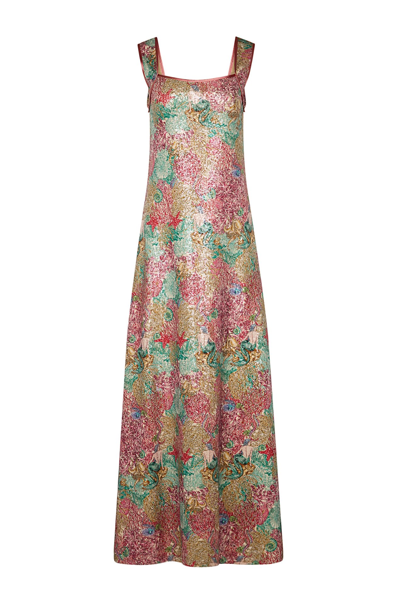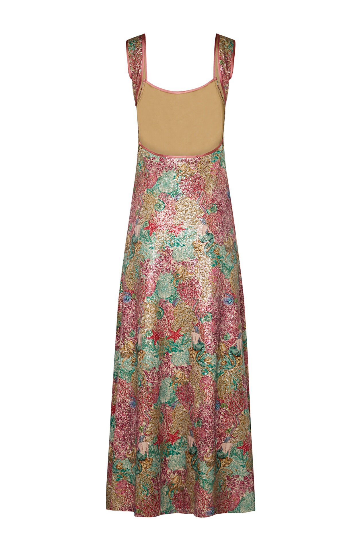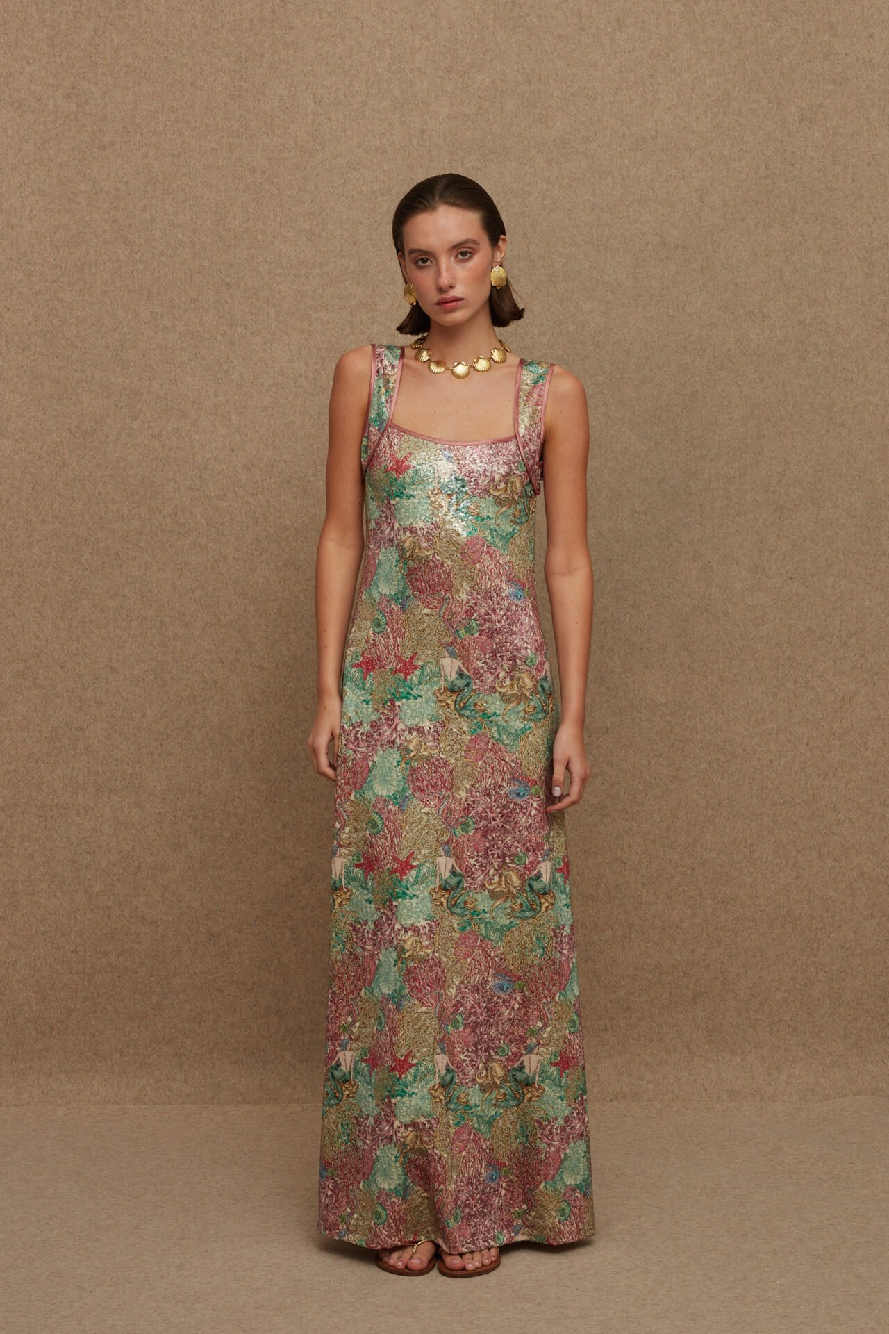 A maxi sequined gown with open back, square décolleté. Perfect for that summer gala invitation.