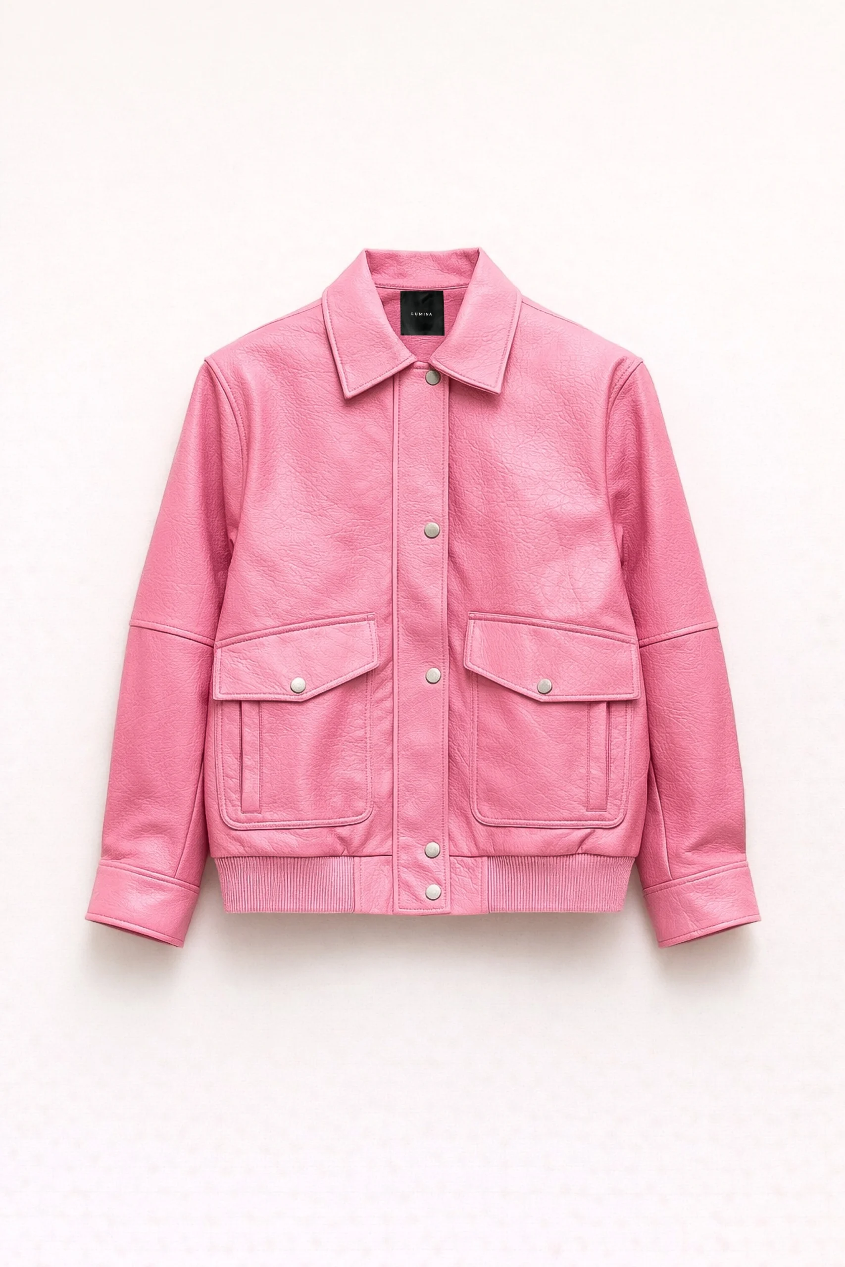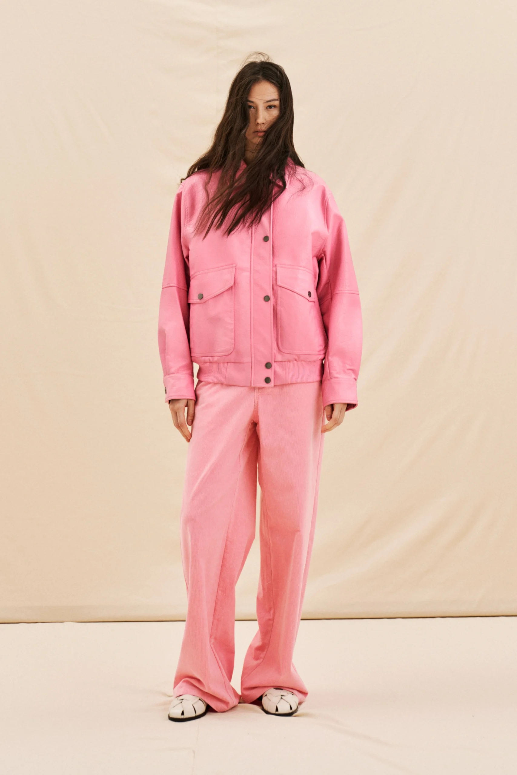 acket made of eco-leather. Pointed collar. Large front pockets. Front closure with zip and buttons.
