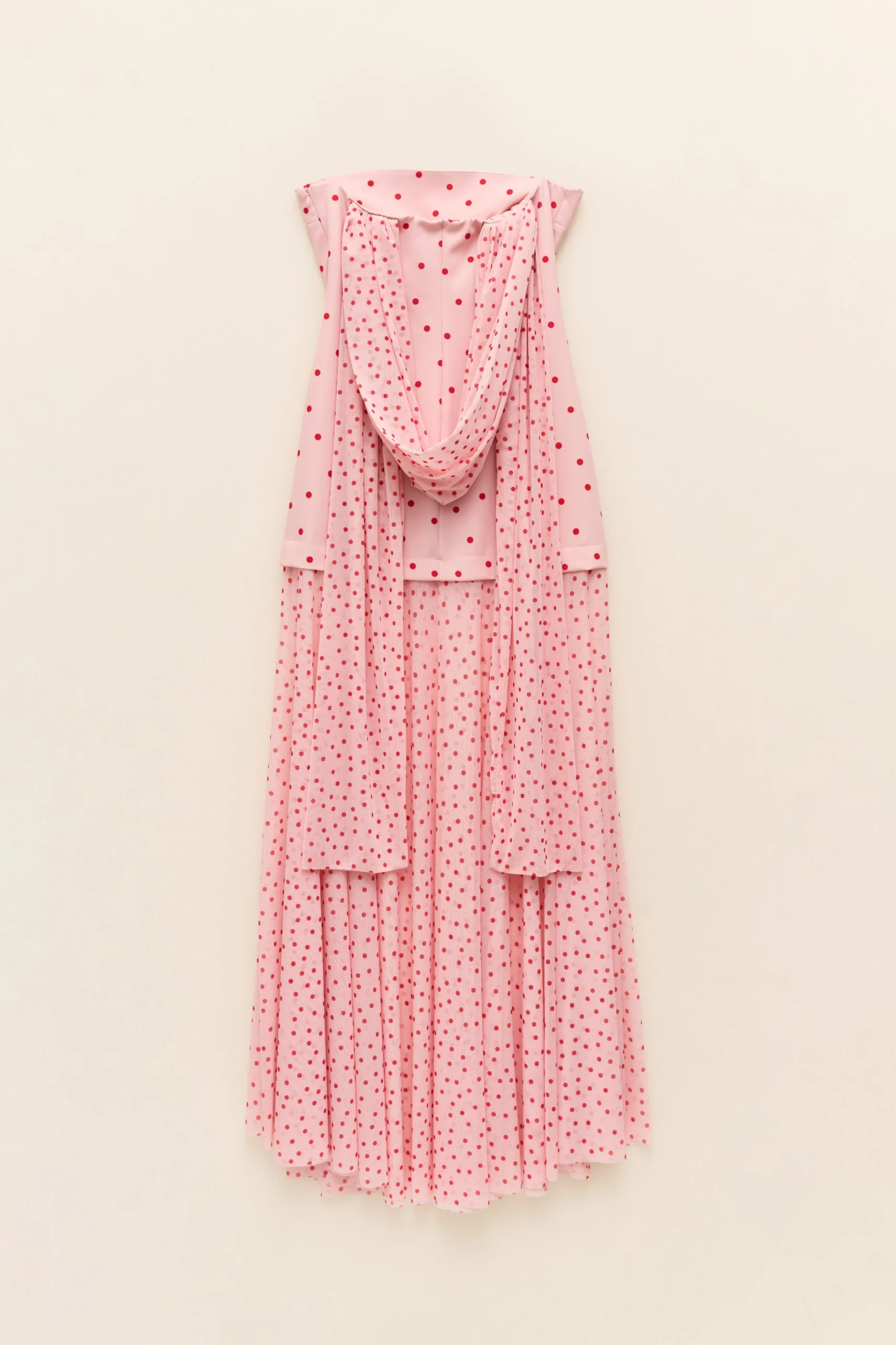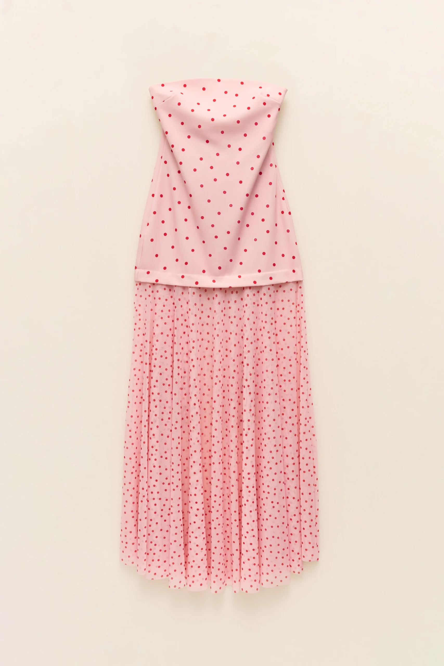 Long bandeau dress combined. Polka dot print pattern. Tulle skirt detail. Side zip closure.