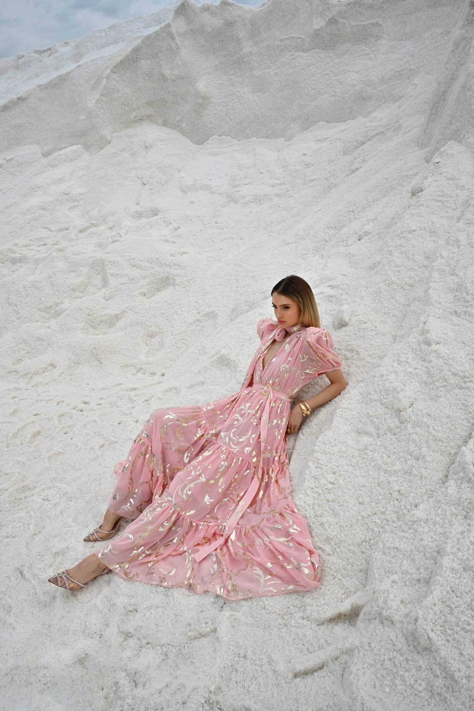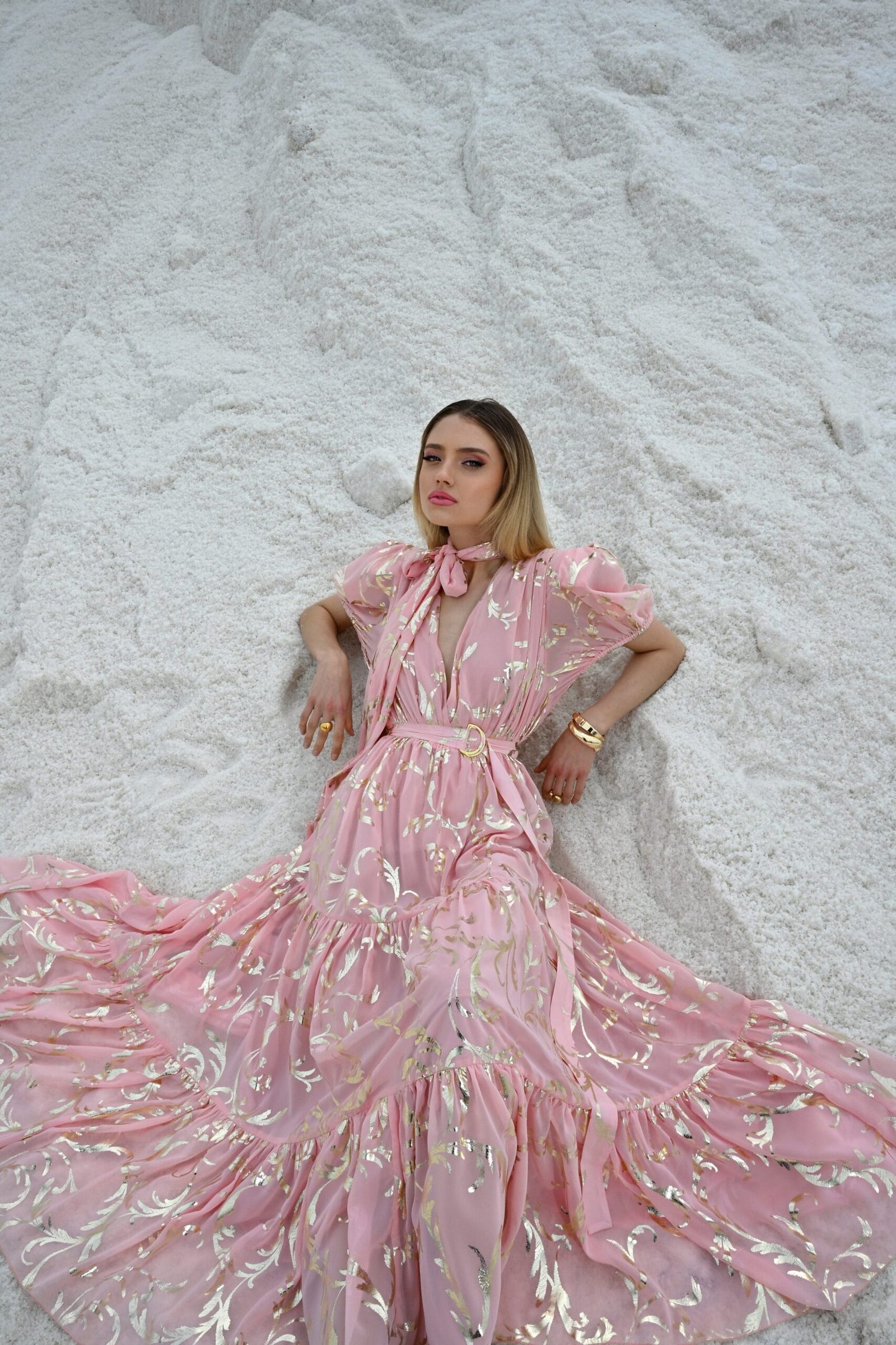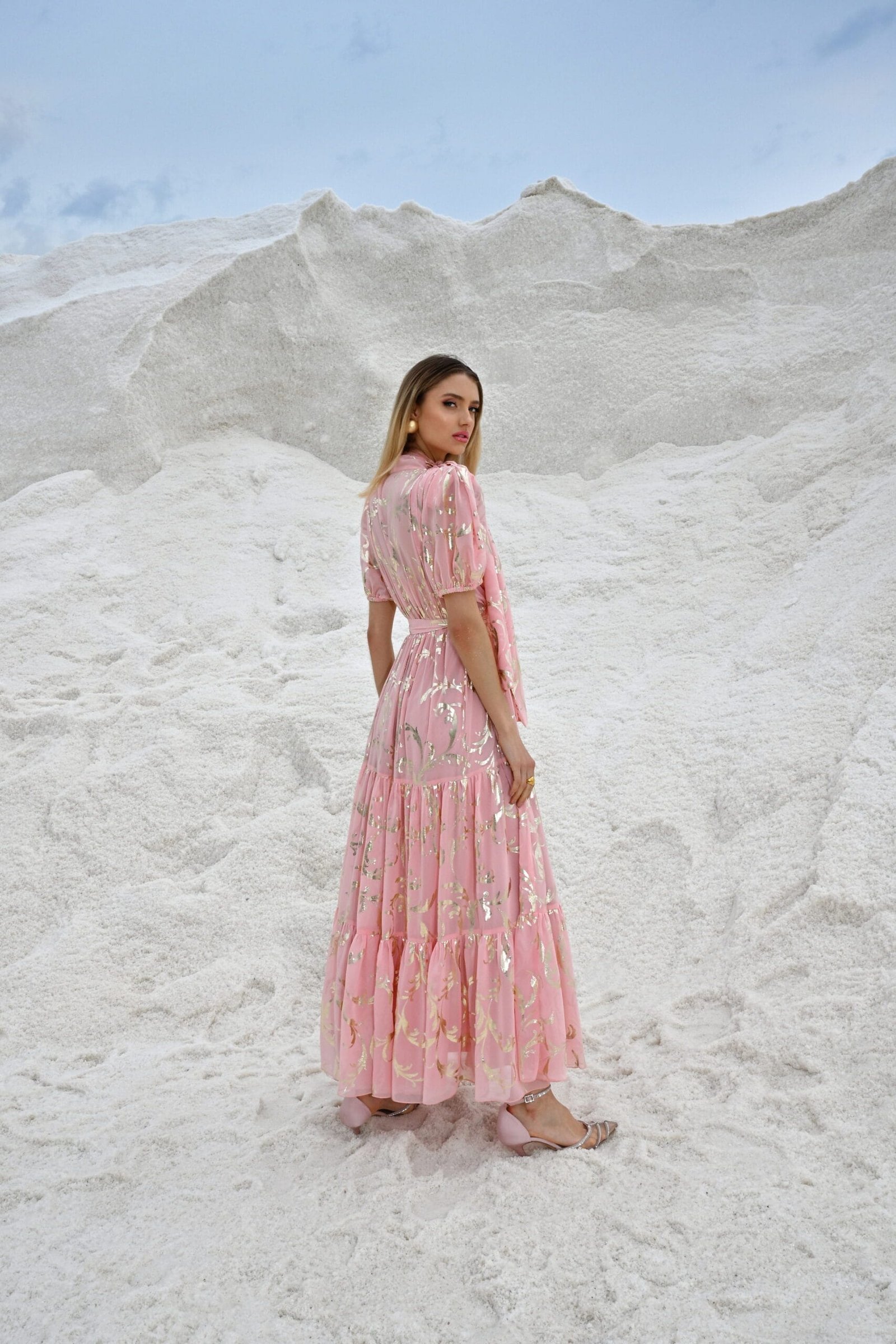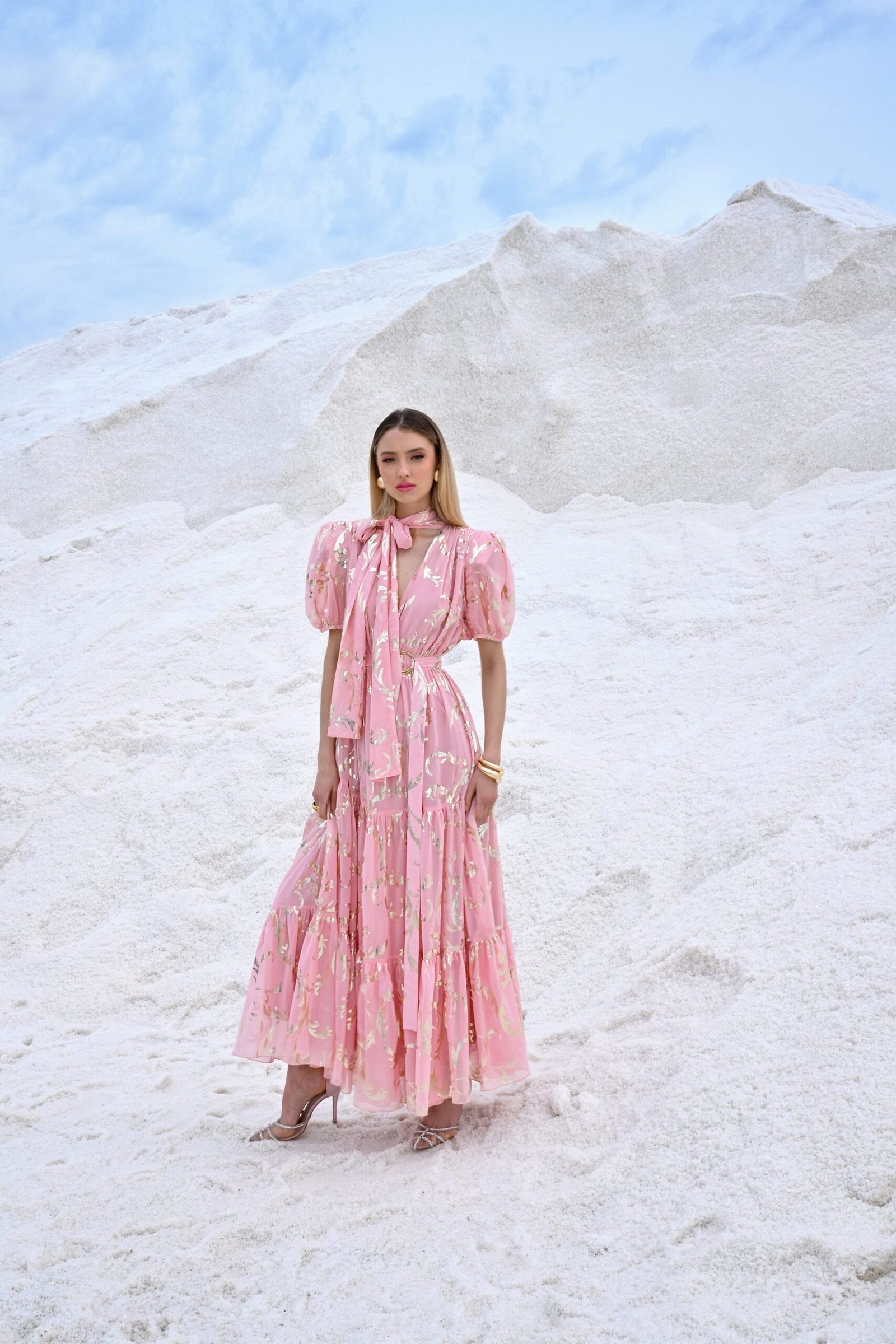 Maxi φόρεμα με μεταλλικό τύπωμα, έντονους ντραπαρισμένους ώμους με βάτες, κοντό μανίκι με λάστιχο, δέσιμο στον λαιμό, τριπλό βολάν στο κάτω μέρος, φοδραρισμένο.