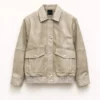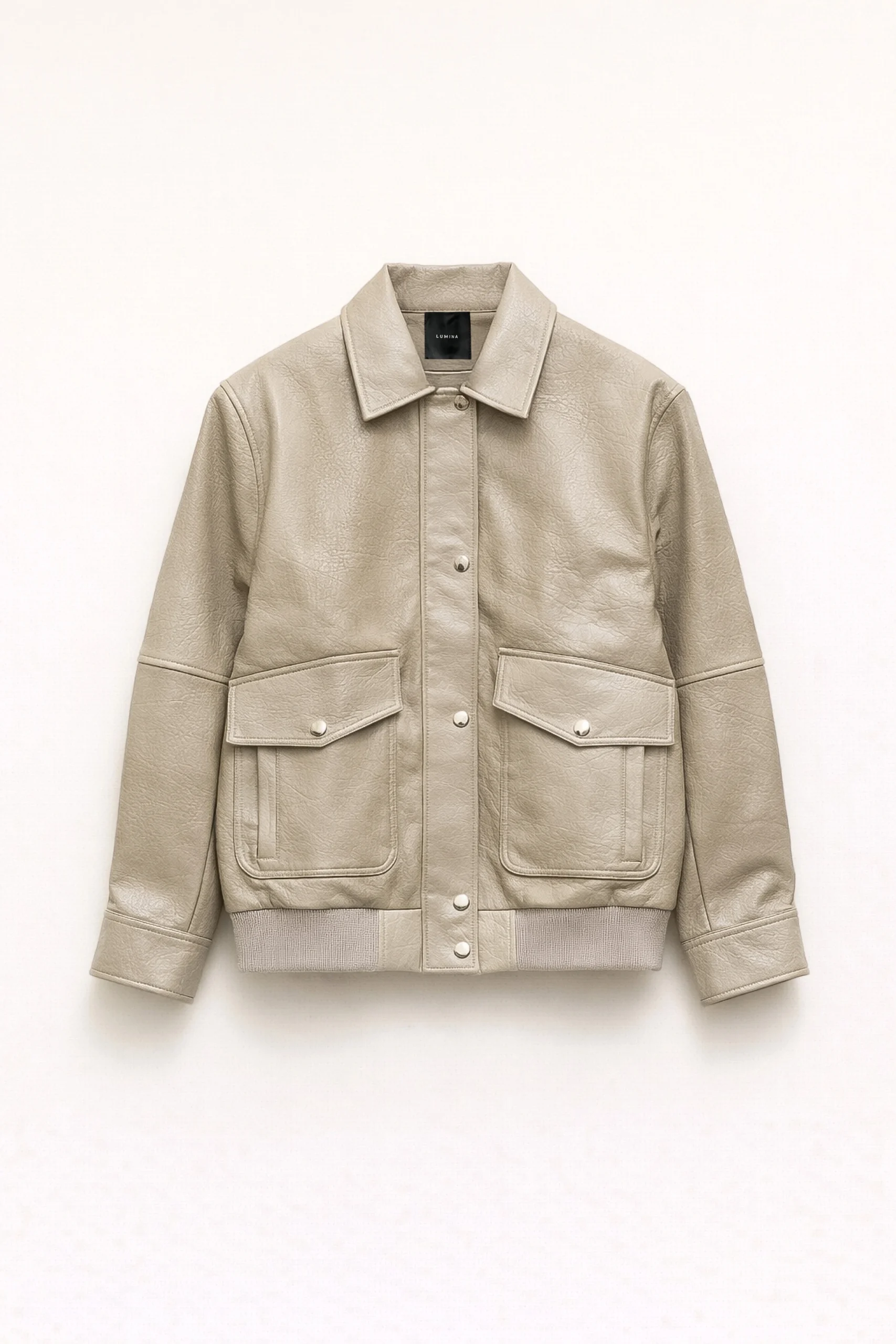Jacket made of eco-leather. Pointed collar. Large front pockets. Front closure with zip and buttons.