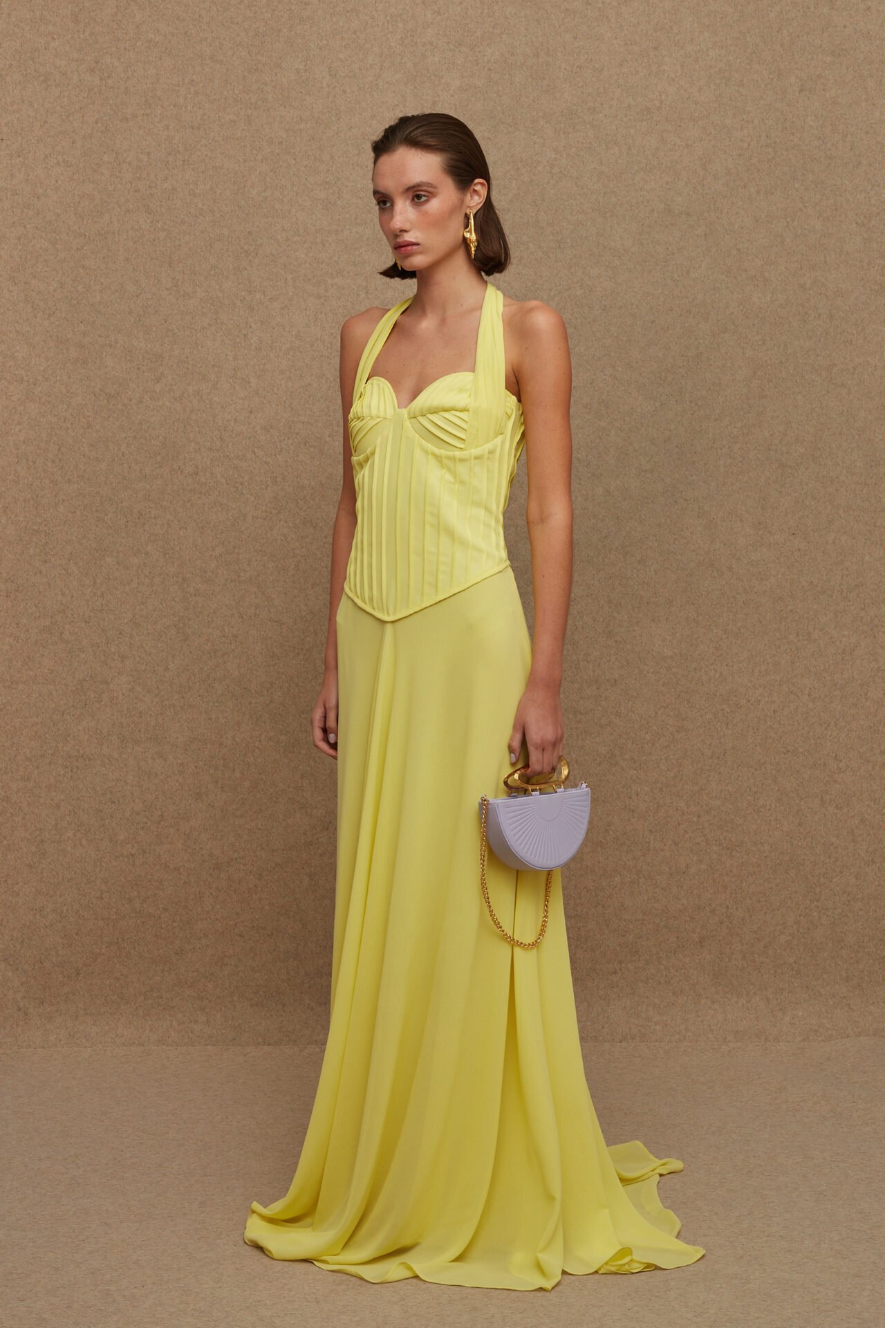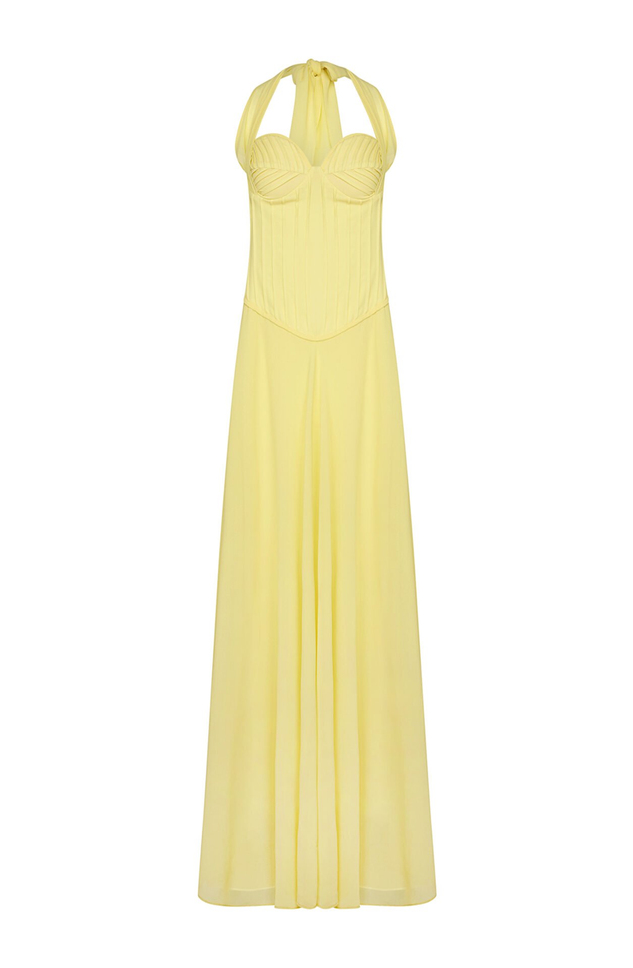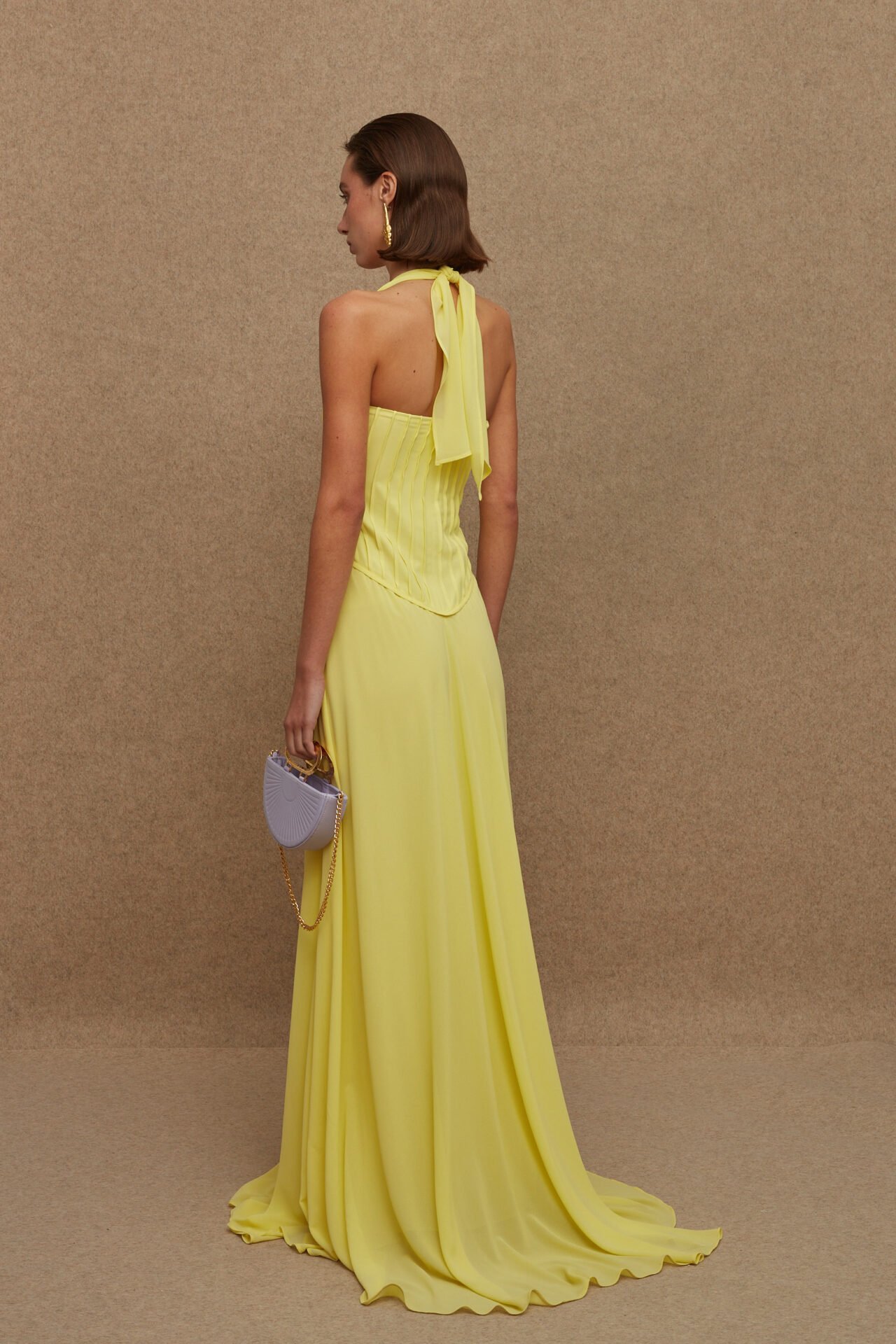 100% POL Full length dress Lightweight fabric Bustier that flatters the waist Removable neck tie