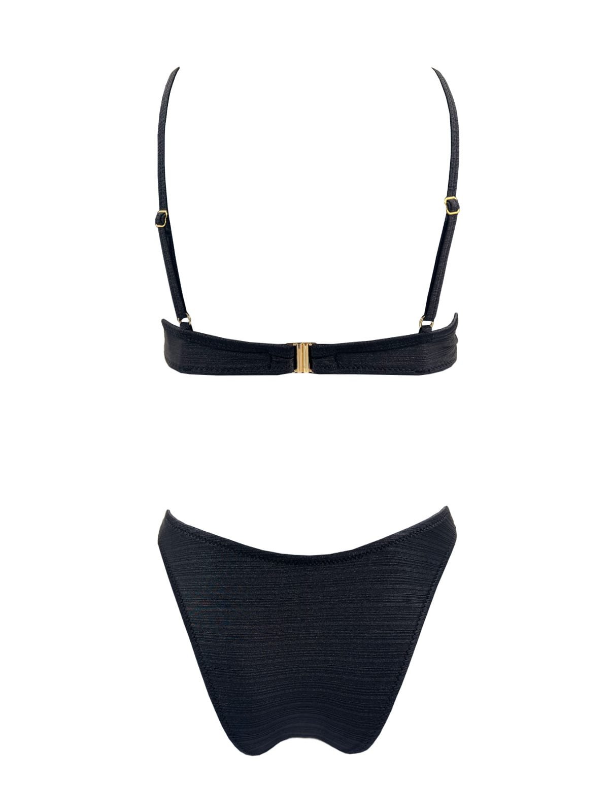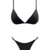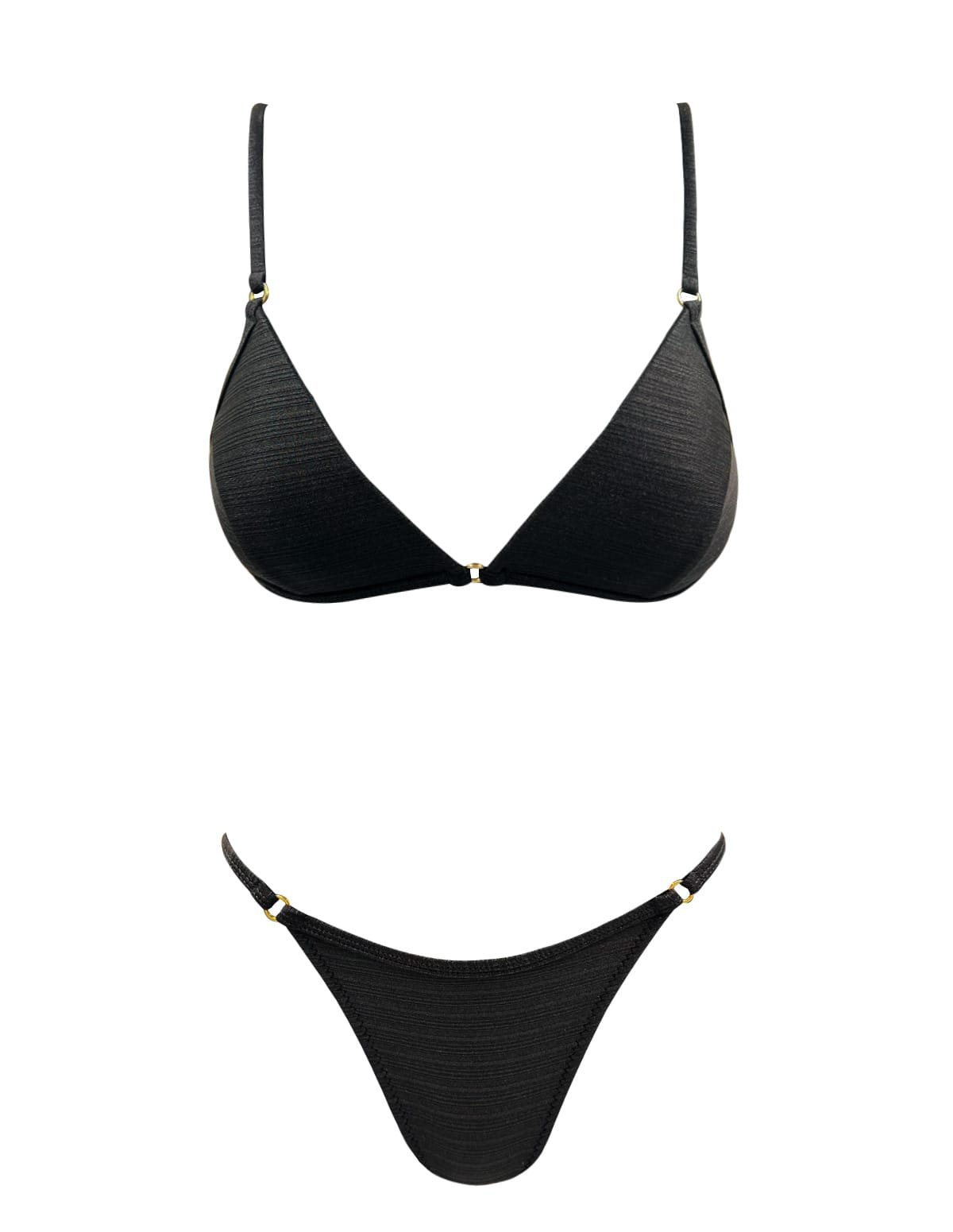 Triangle bikini top with adjustable straps and back hook closure and mid – rise full bikini bottom with small decorative rings.