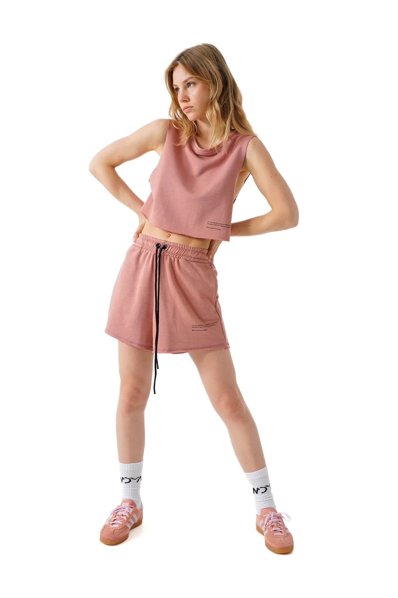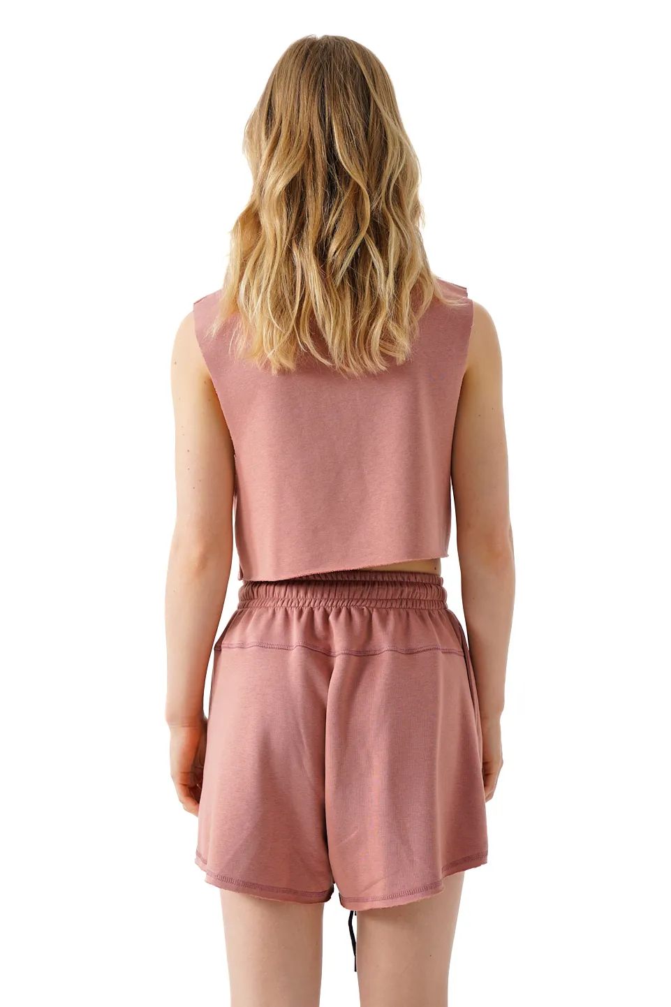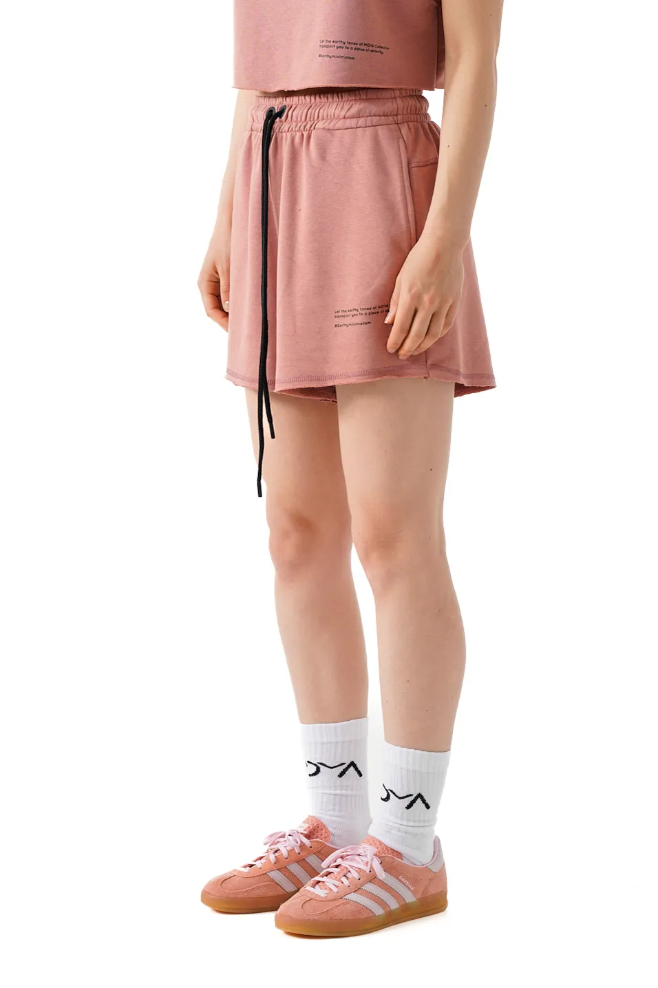 High – waist shorts with an elasticated waistband with adjustable drawstrings. Side pockets and contrast patch on the leg.