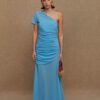 A maxi one-shoulder gown with draping details & a shoulder cape.