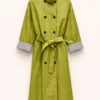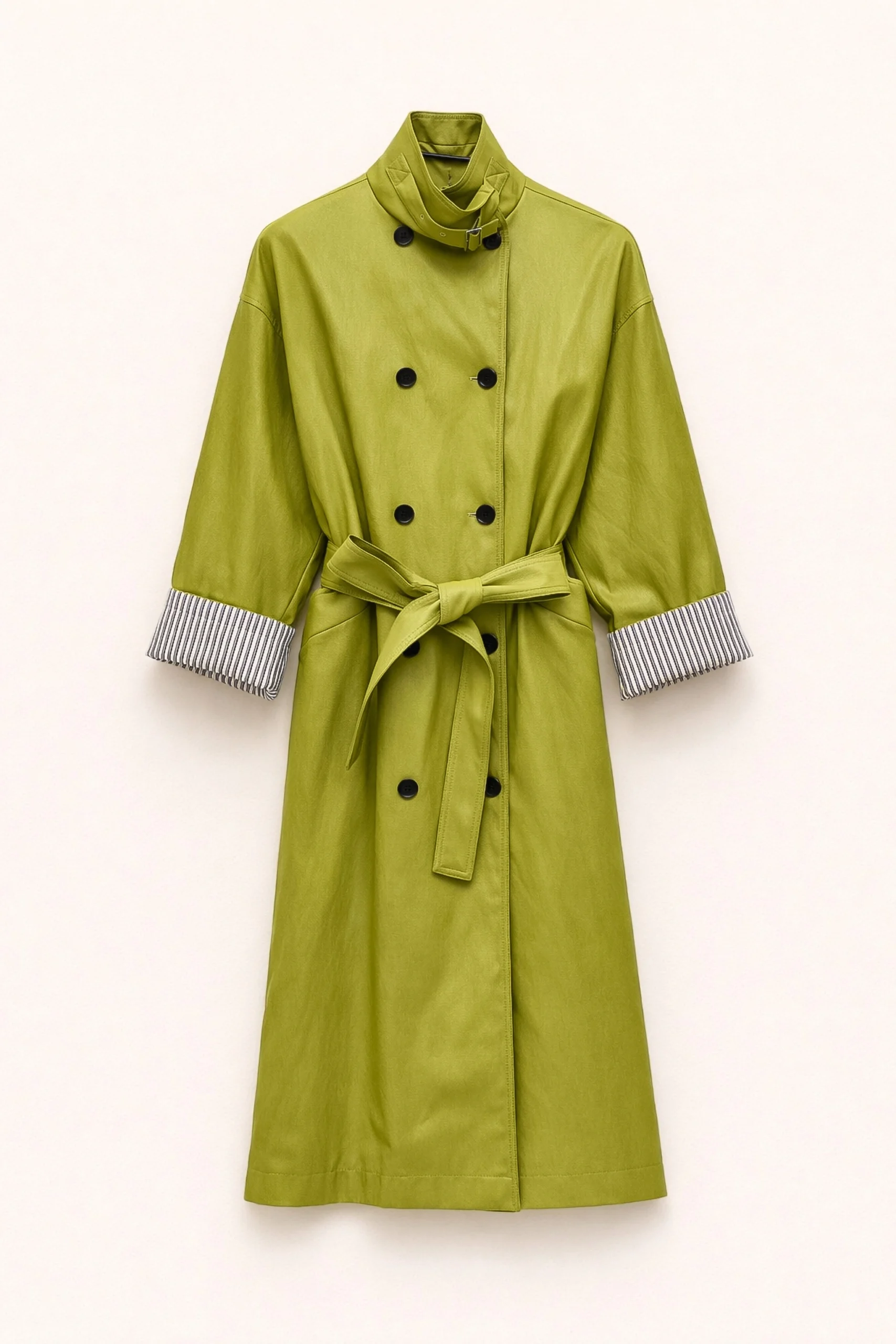 Trench coat made of eco-leather. Double-breasted with buttons. High neck and belt at the waist. Contrasting cuff detail.