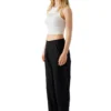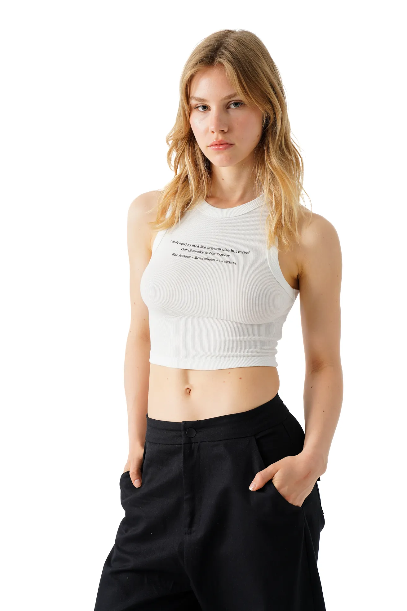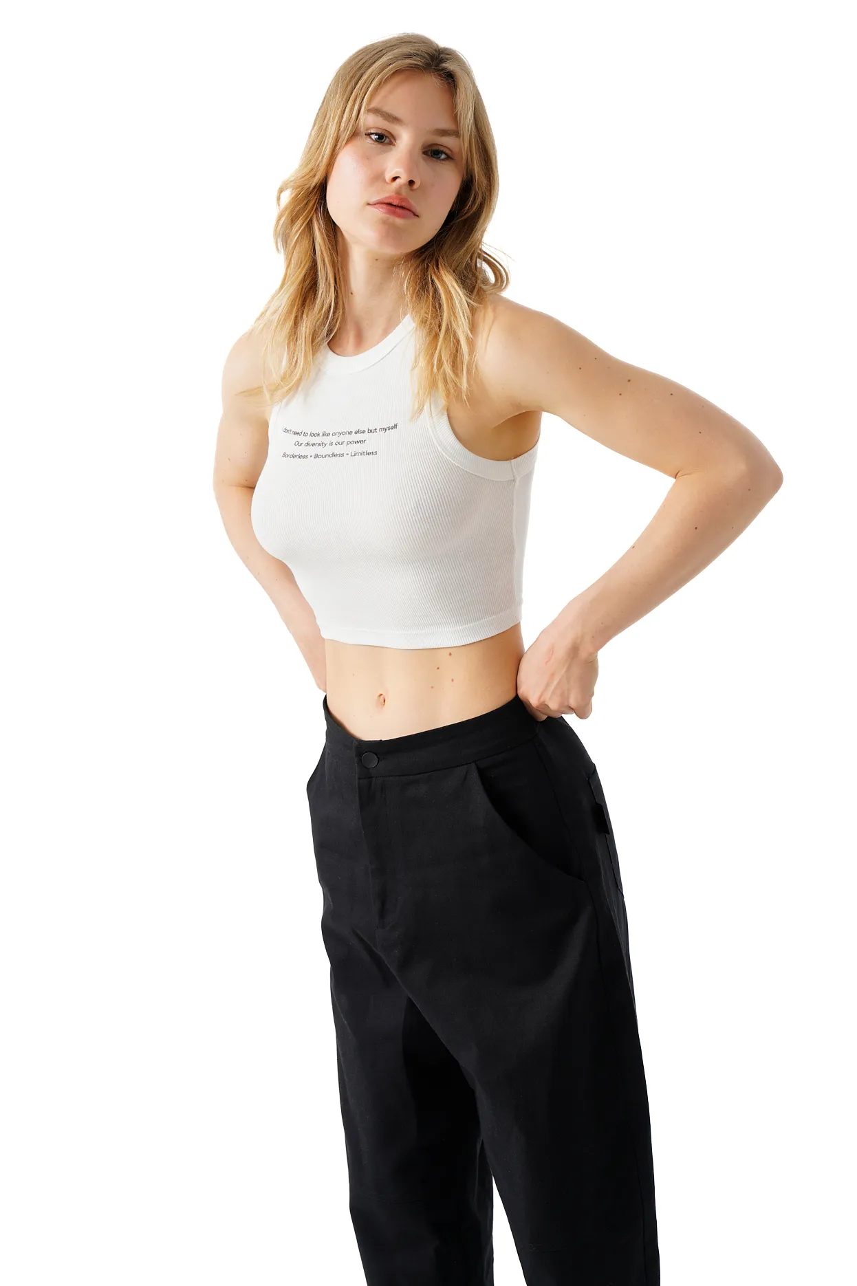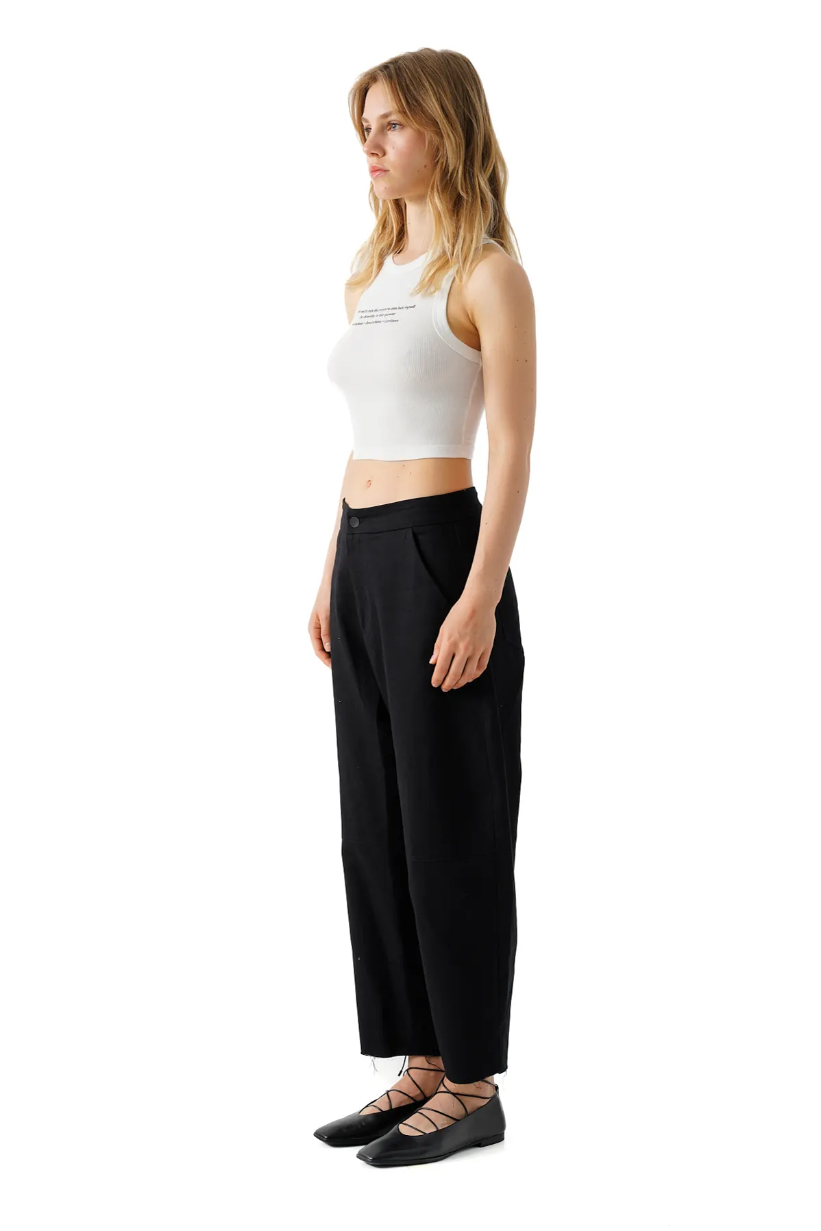 Cropped trousers with front pockets and a belt. Pockets at the back and front zip fly.