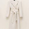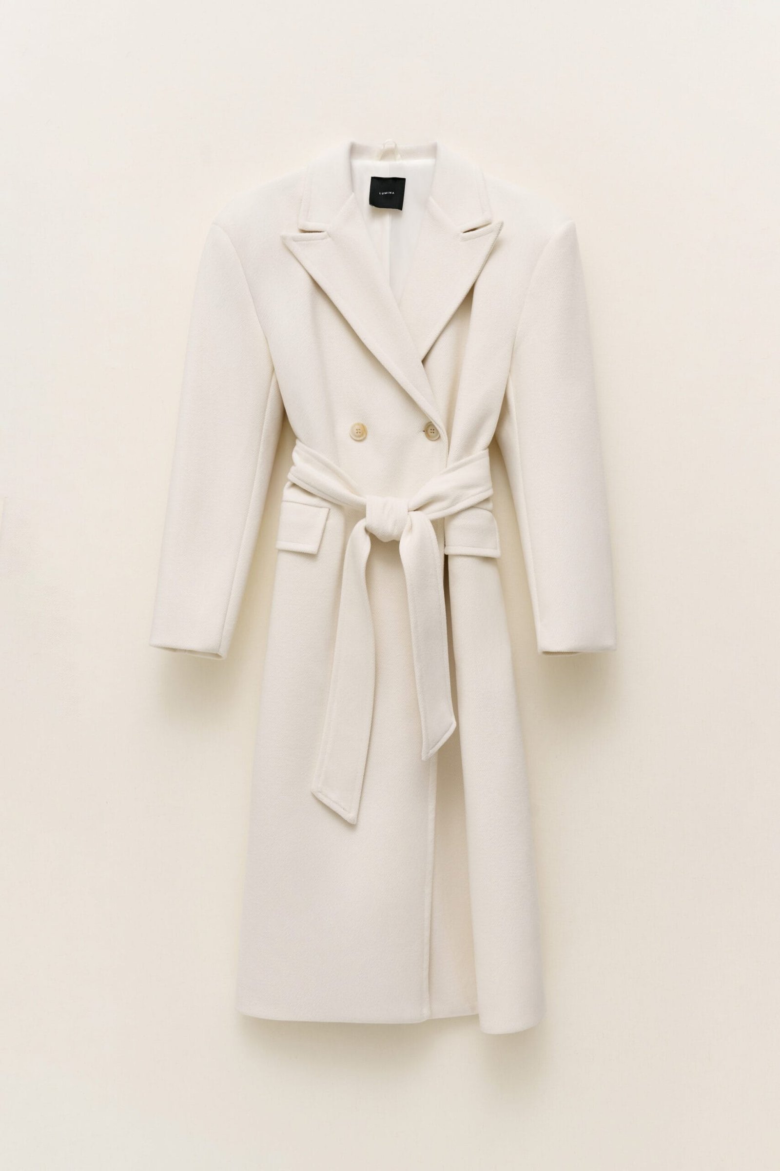 Long double-breasted coat. Lapel collar and padded shoulders. Adjustable waist belt. Front pockets with flap.
